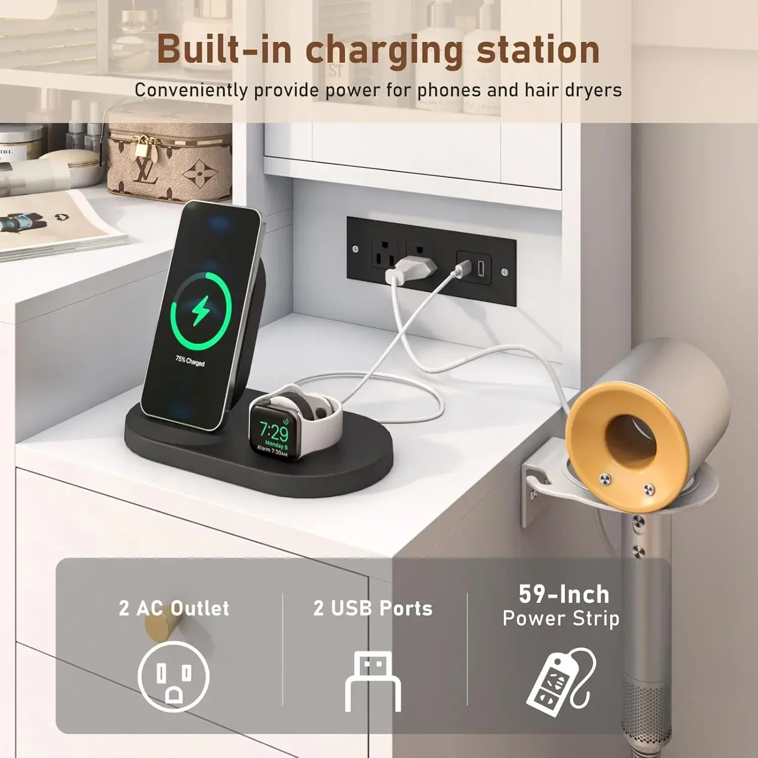 - Built-in Charging Station: Equipped with 2 standard outlets and 2 USB ports, it allows you to charge devices or use hair tools effortlessly.