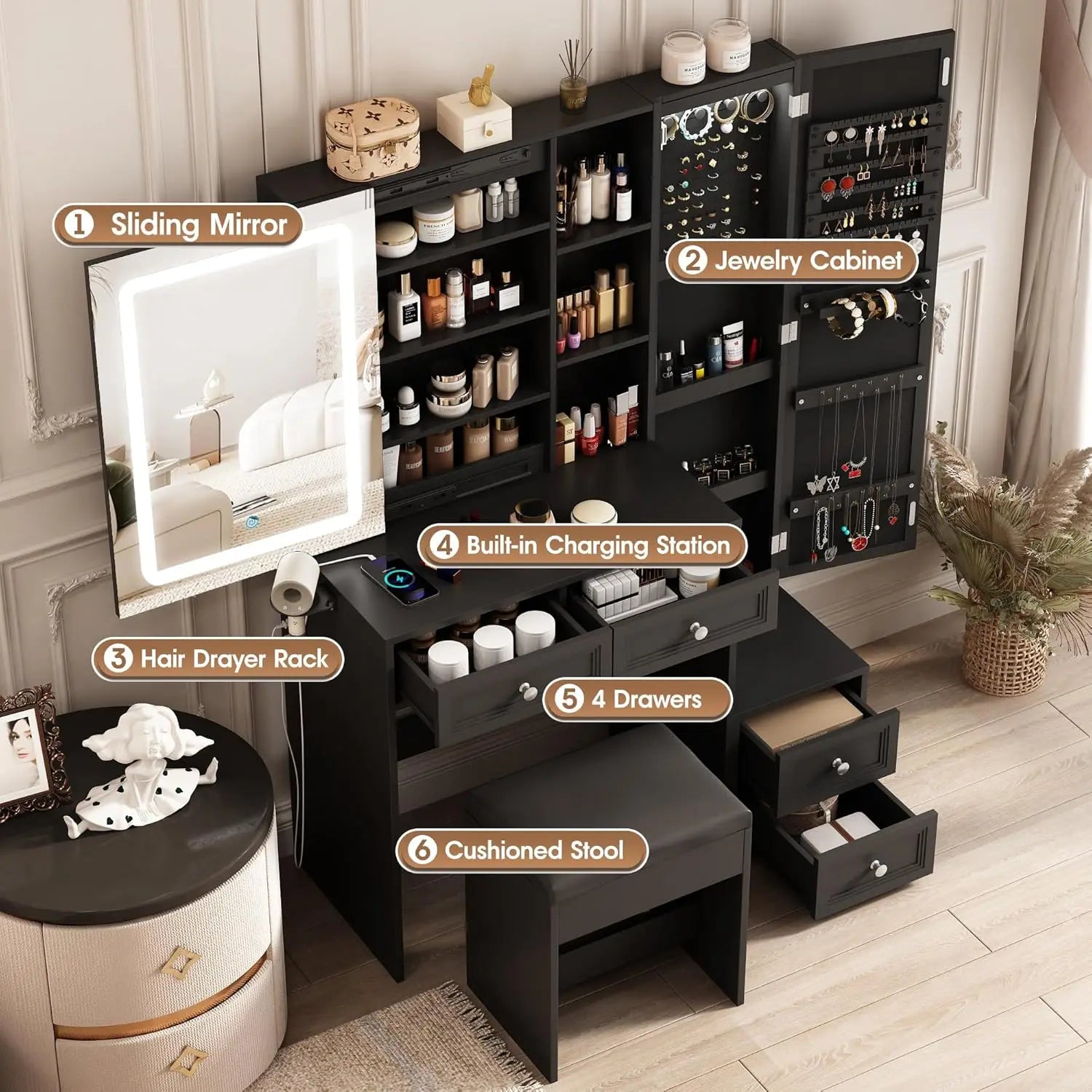 Makeup Vanity Desk with LED Mirror Jewelry Storage Charging Station