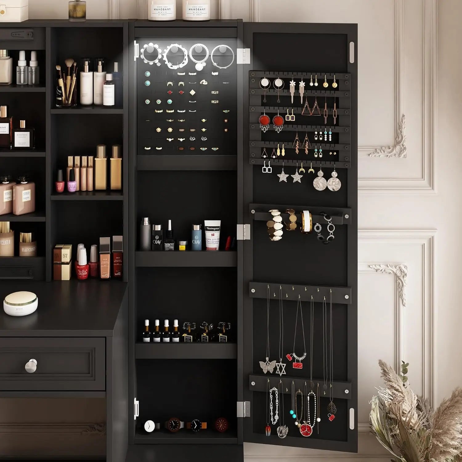 - Functional 2-in-1 Design: This makeup vanity boasts a super large capacity with a jewelry cabinet, 4 spacious drawers, and multiple shelves, allowing you to store all your cosmetics and jewelry effortlessly.