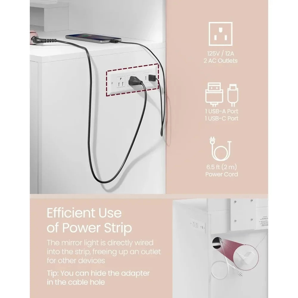 - Convenient Power Hub: Equipped with a built-in power strip including 2 outlets, 1 USB-A, and 1 USB-C port, this vanity desk allows you to power your hair tools and charge devices without hassle.