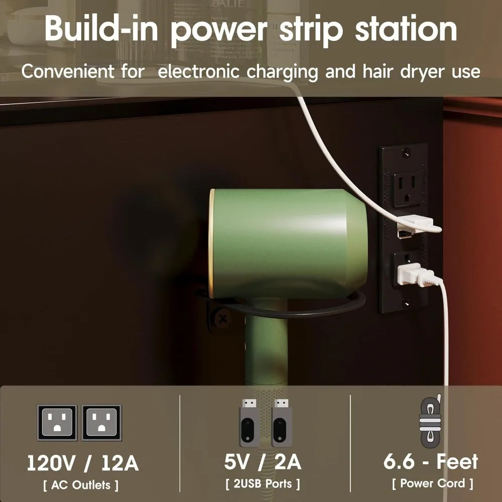 - Multi-functional Features: Equipped with 2 standard sockets and 2 USB charging ports, you can charge multiple devices simultaneously. An added hair dryer holder keeps styling tools within reach.