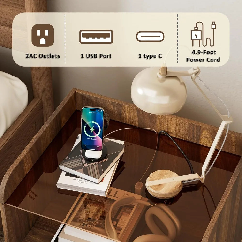 Mid Century Modern Nightstand with Charging Station and Glass Top