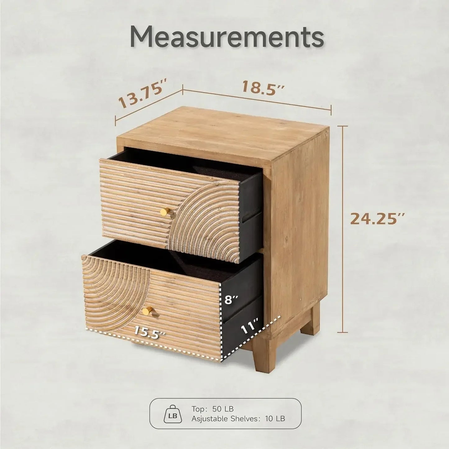 Introducing the Ljustra 2-Drawer Nightstand Set, a perfect blend of modern design and rustic charm. This fully assembled set of two nightstands features a unique handcrafted wood ring pattern, elevating the decor of any bedroom, living room, or entryway.