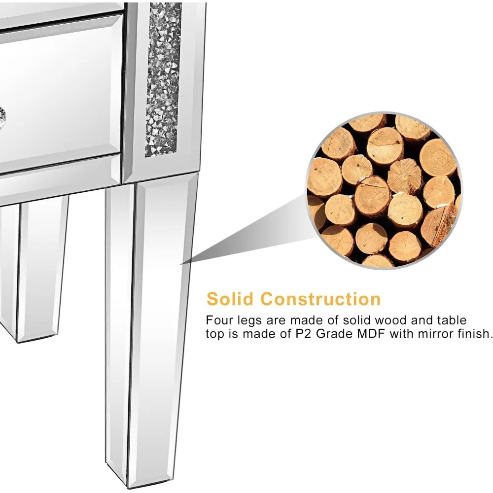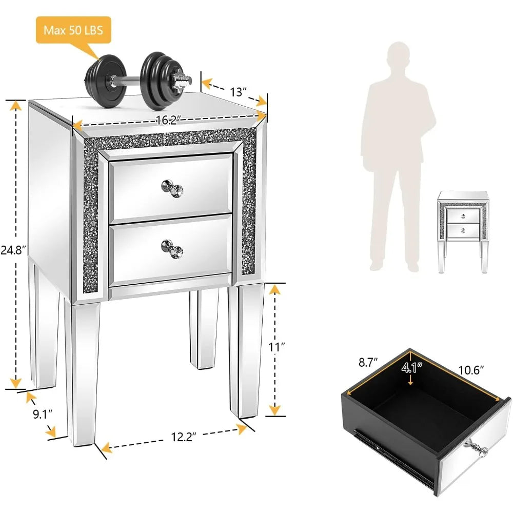 - Mirrored Finish: The complete mirrored surface reflects light and enhances your space, while the diamond gem accents on the drawers add a touch of glamour.