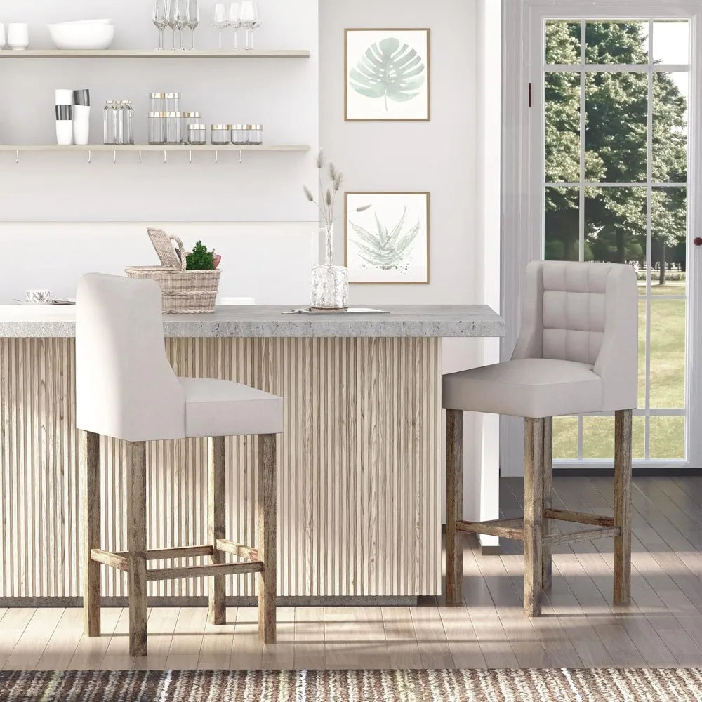 Elevate your dining experience with the Ljustra Modern Bar Stools. This stylish set of two barstools features tufted upholstered backs and sturdy rubber wood legs, making them perfect for your kitchen or dining room.