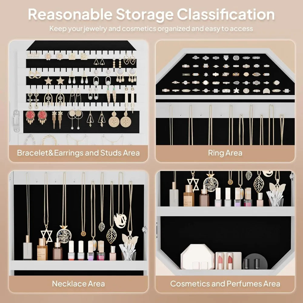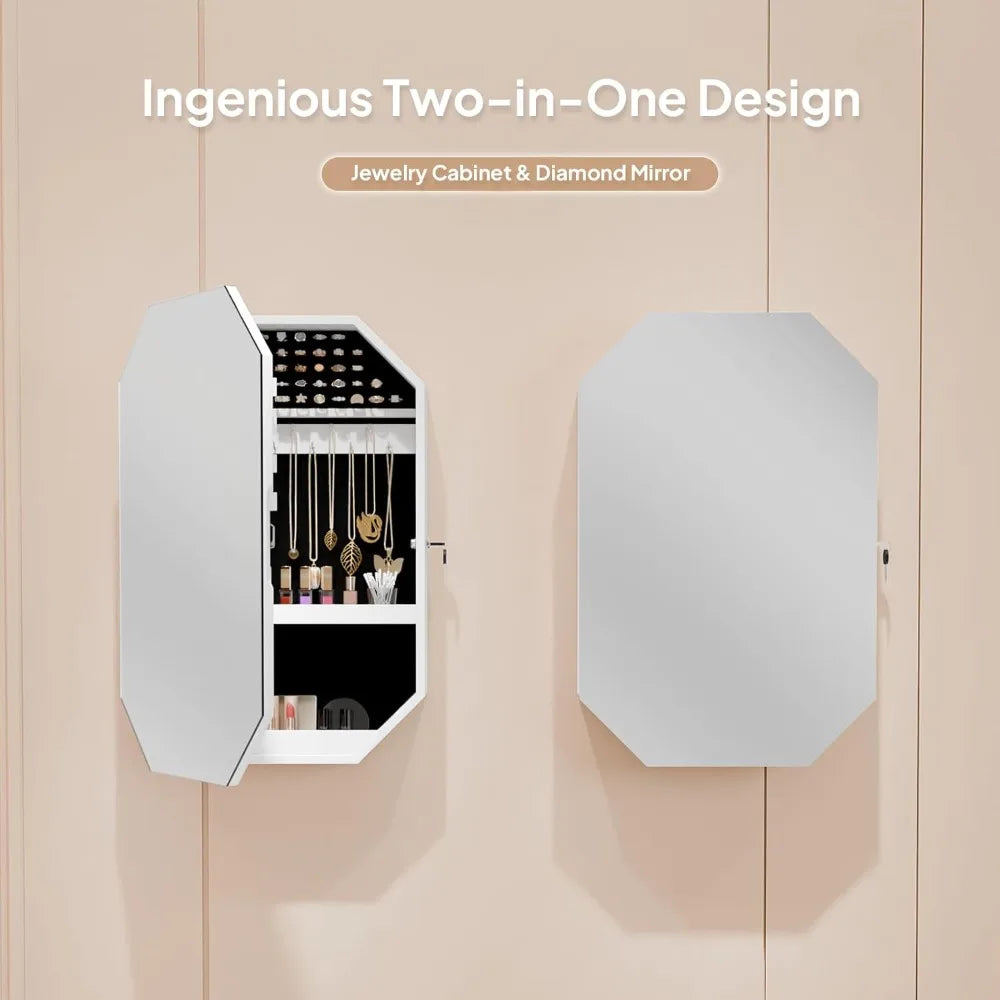 Discover the perfect blend of style and functionality with the Ljustra Modern Diamond-Shaped Jewelry Armoire. This exquisite octagonal jewelry cabinet not only keeps your treasures organized but also serves as a stunning wall-mounted mirror, bringing a touch of sophistication to any room.