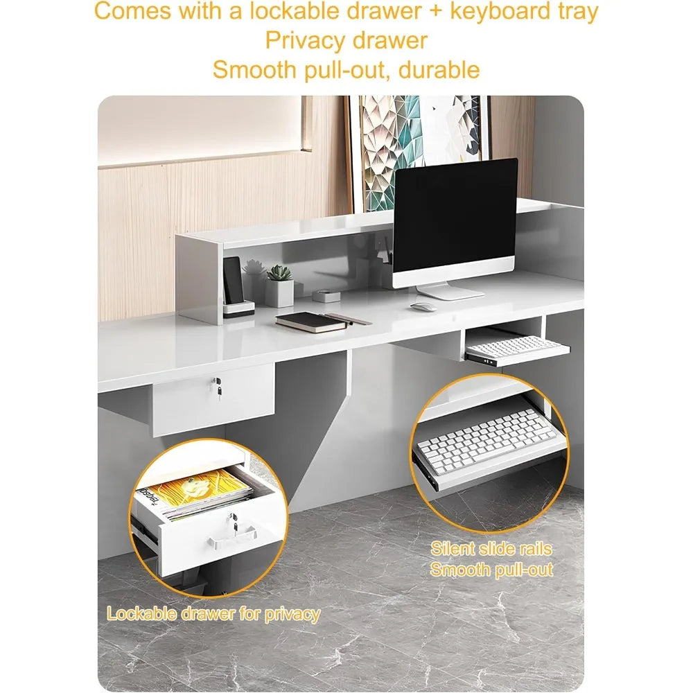 Introducing the Ljustra Modern Reception Desk, a perfect blend of style and functionality designed to enhance your professional space. This reception desk features a spacious desktop with an elevated hutch, making it ideal for welcoming guests or managing business tasks.