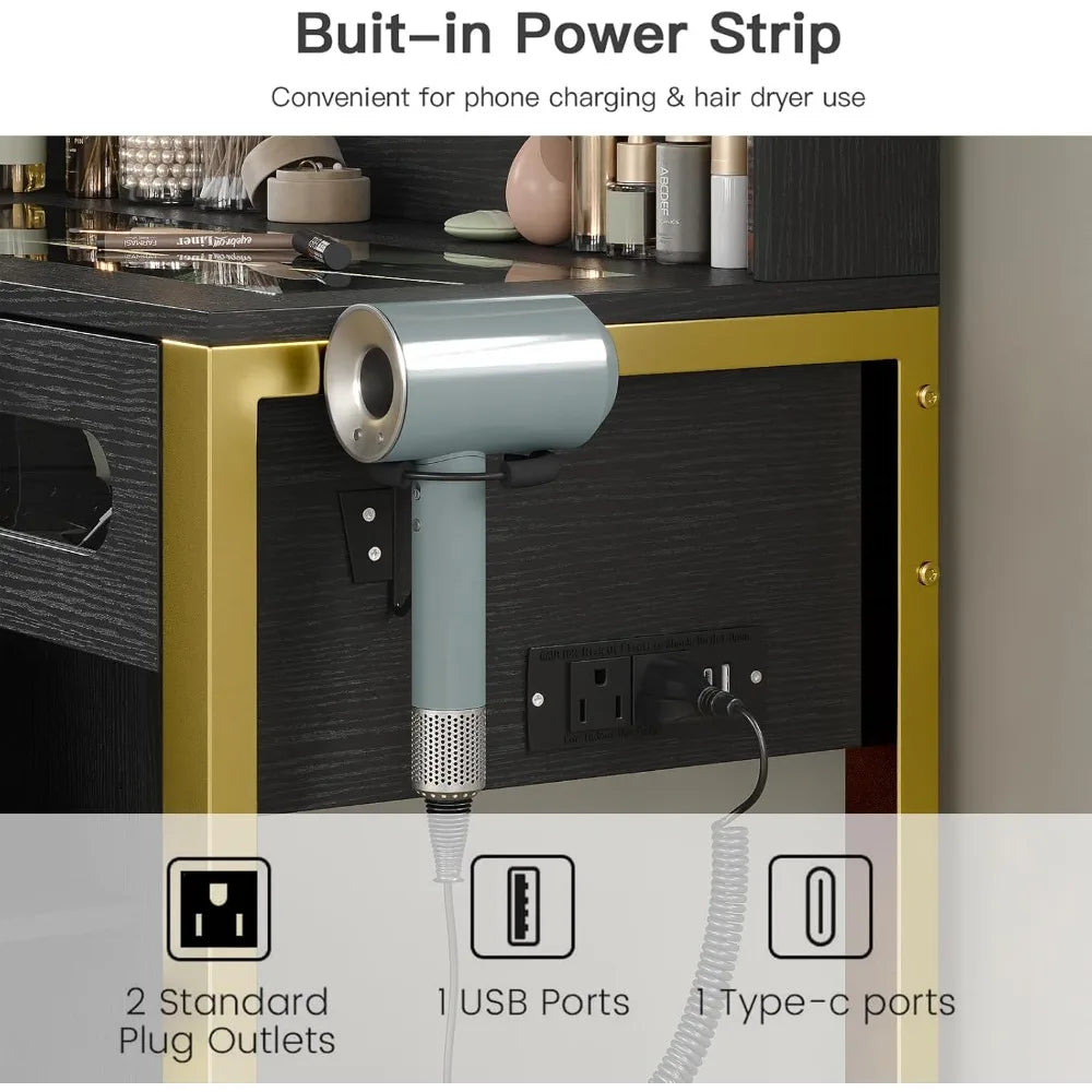- Convenient Power Outlet: Equipped with 2 AC outlets, 1 USB, and 1 Type-C port, plus a hair dryer rack for easy access to all your styling tools.
