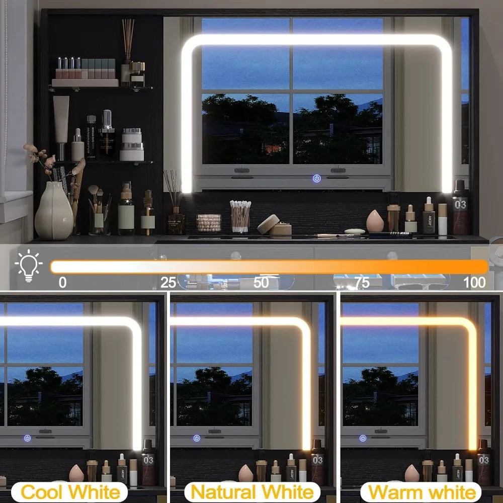 Modern Vanity Desk with Mirror and RGB Drawers Power Outlet Makeup Station