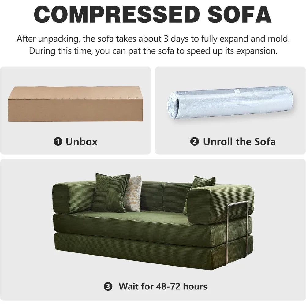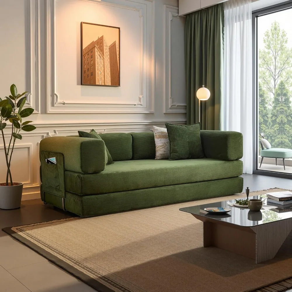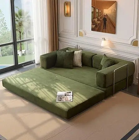 - 2-in-1 Convertible Design: Effortlessly switch from a stylish green couch to a comfortable bed or lounging chaise.