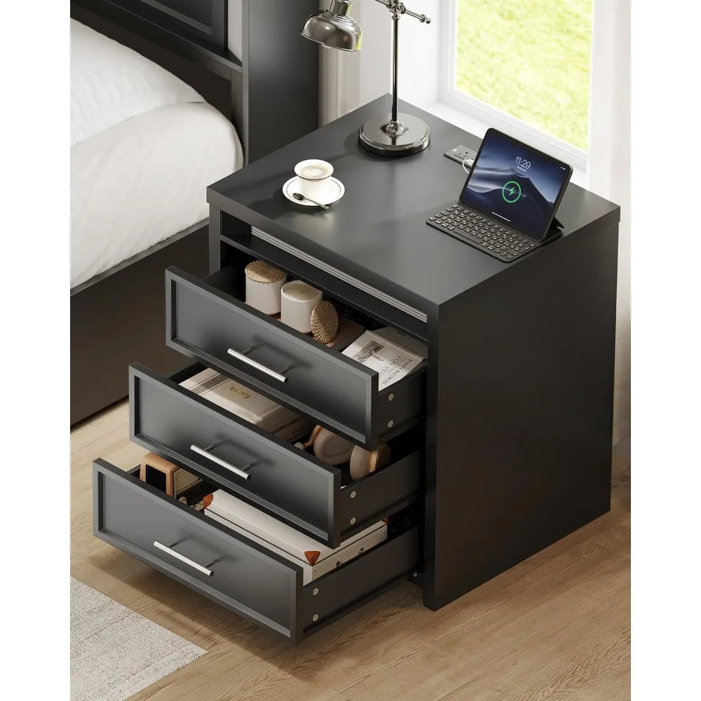 Night Stand with Charging Station LED Lightbox 3 Drawer Bedside Table