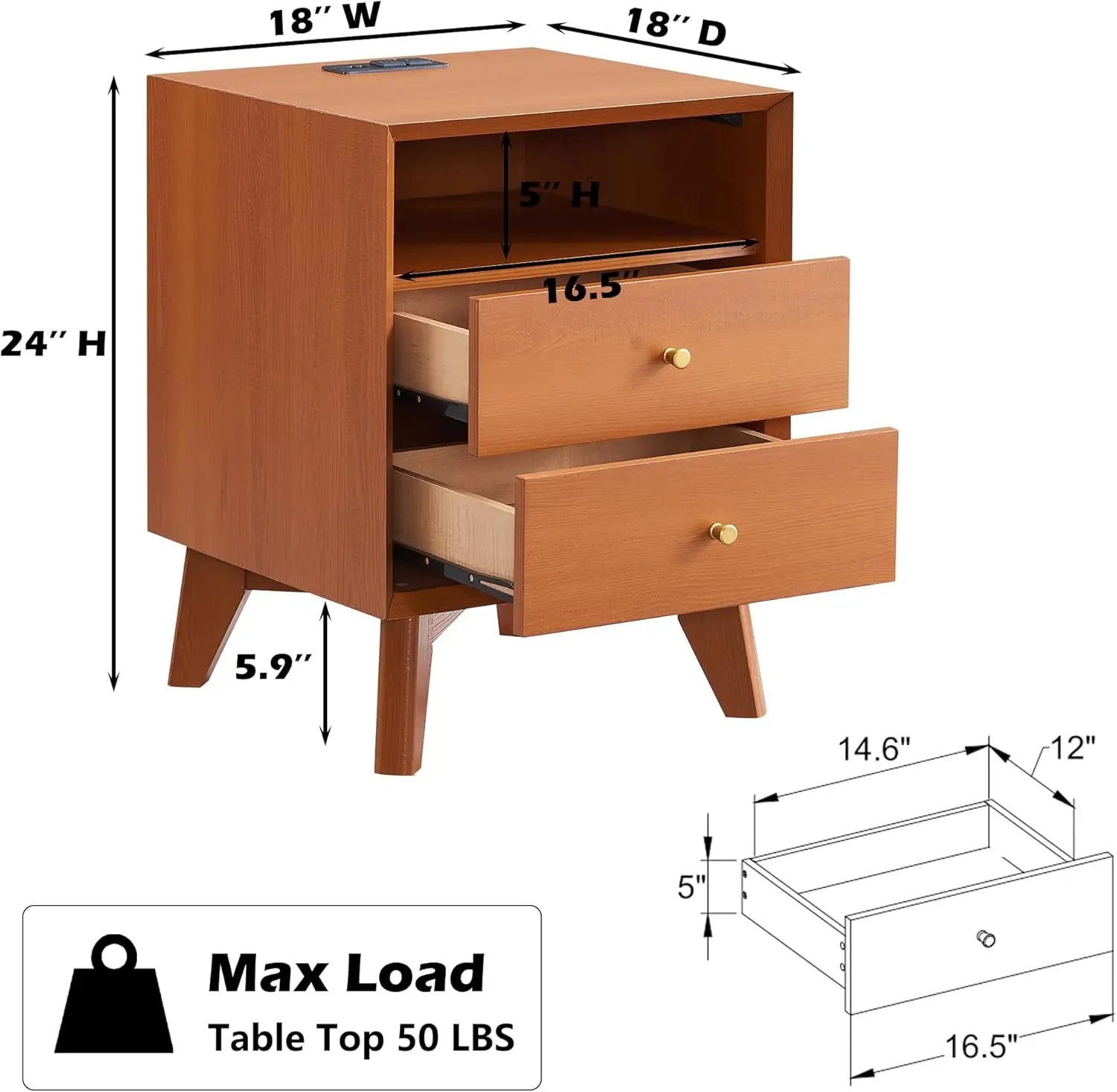 Nightstand with Charging Station Mid Century Modern Side Table Storage