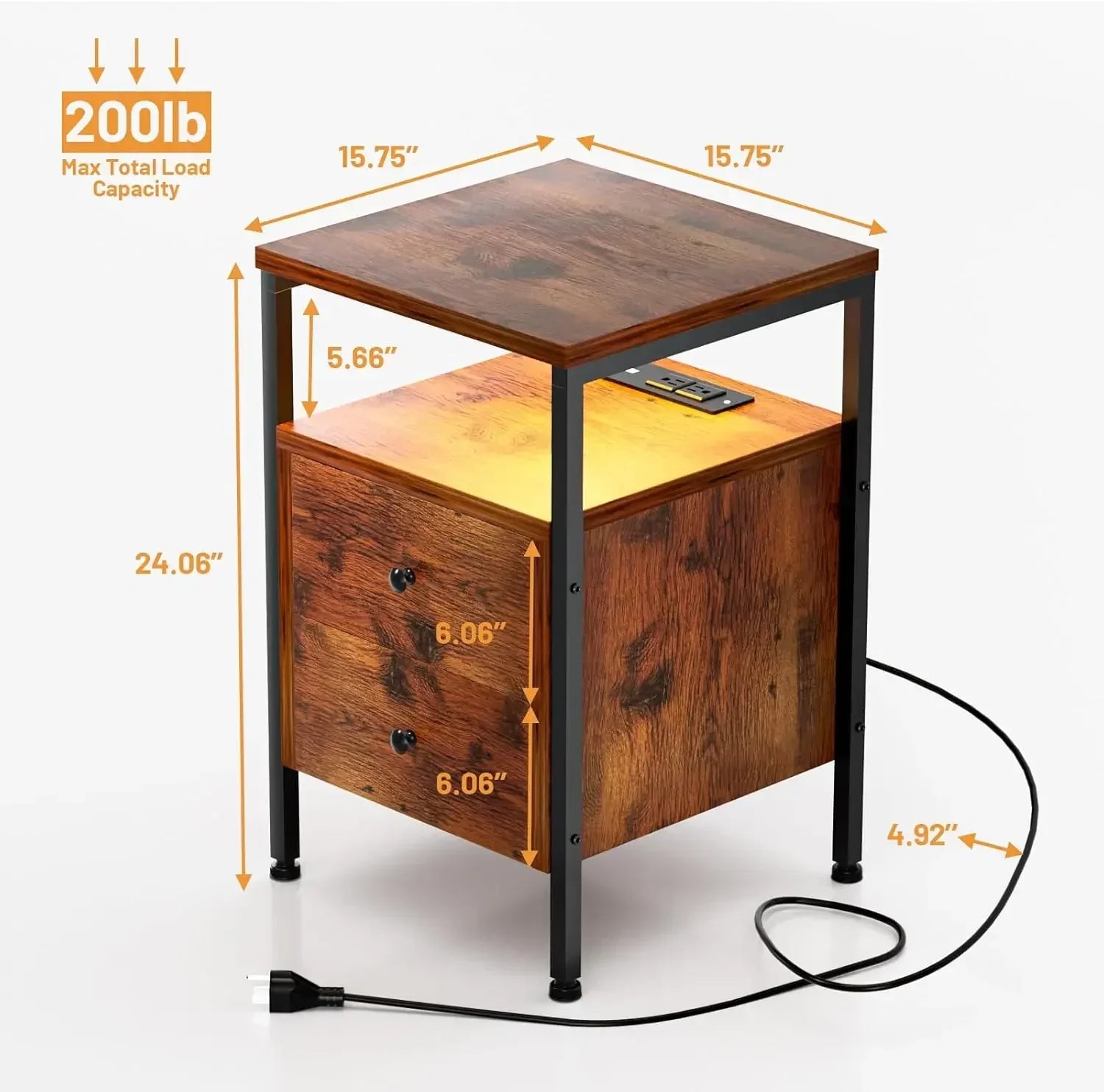 Nightstand with LED Light Charging Station 2 Drawers Rustic Wood Table