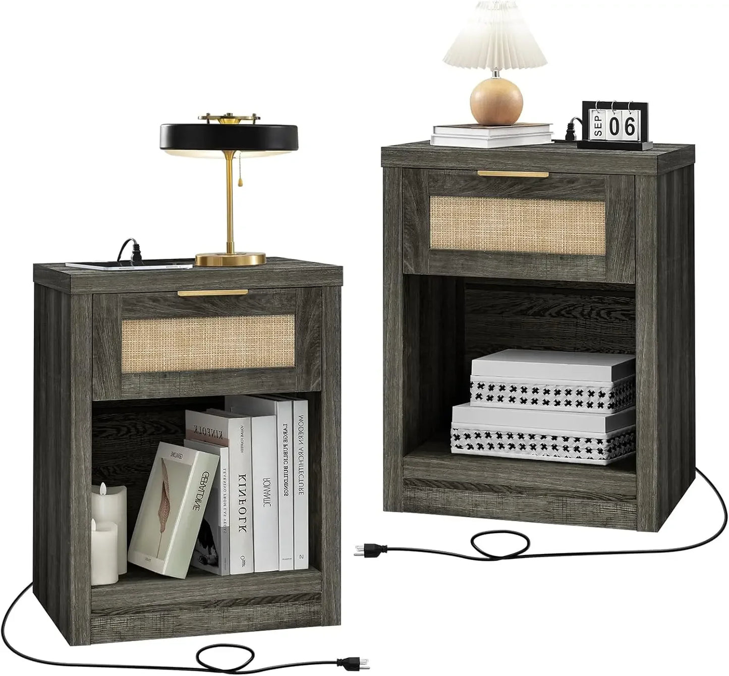 Nightstand Set of 2 Rattan Bedside Table with Charging Station