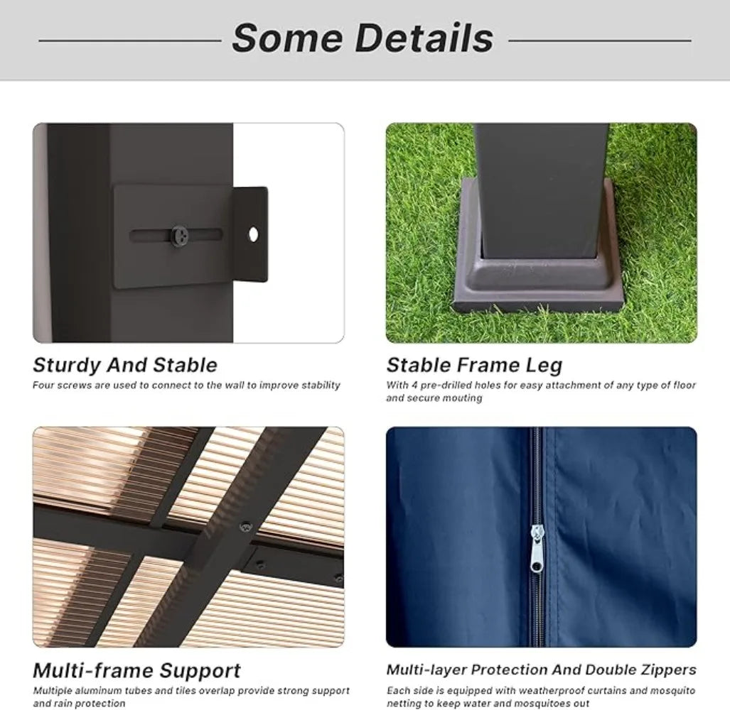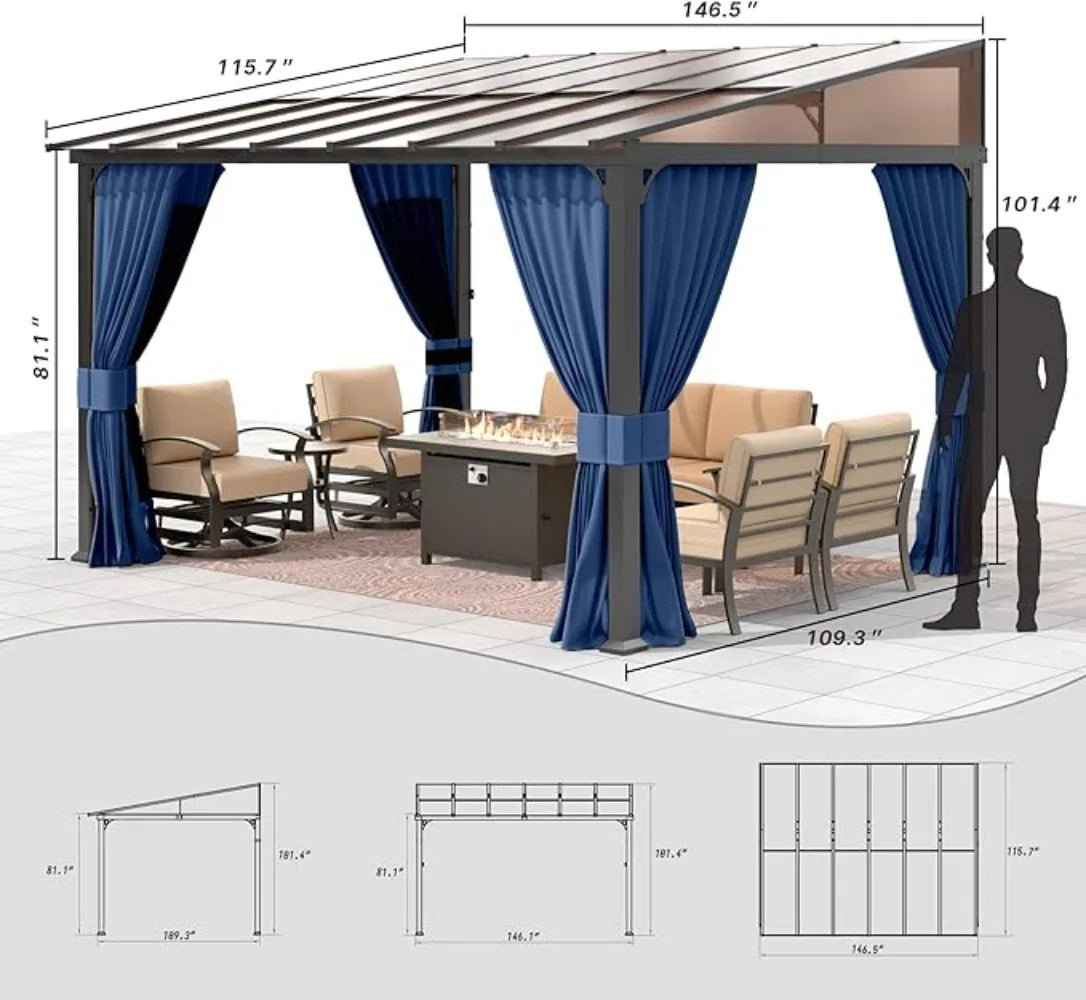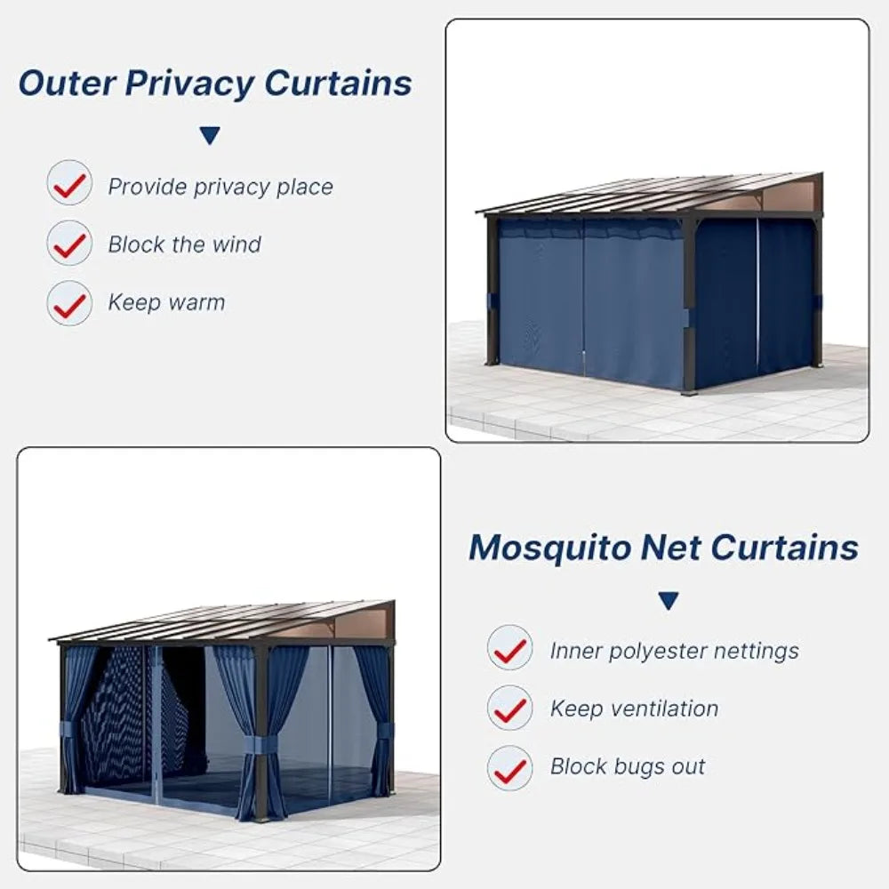 Enhance your garden, yard, or patio with the Ljustra 10FTx12FT Outdoor Wall-Mounted Pergola, designed for both style and functionality. This elegantly crafted gazebo features a sloping sun panel roof and double curtains, providing the ultimate protection from the sun, rain, and insects.