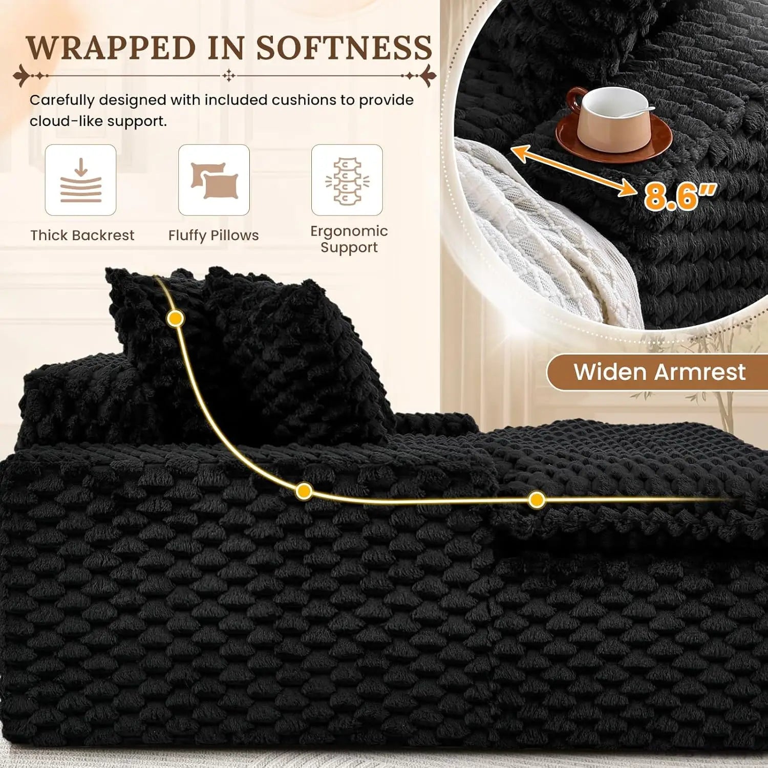 - Ultimate Relaxation: Widened armrests provide ample space for your coffee cup or books, while the large backrest pillow and two fluffy pillows offer triple support for finding your perfect cozy posture.
