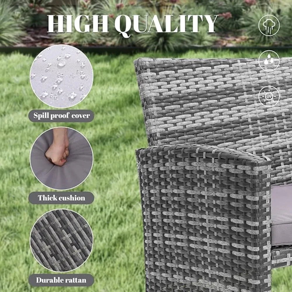 Crafted from high-quality UV-treated rattan and powder-coated steel, this set is built to withstand the elements while maintaining a modern aesthetic. The cushions are filled with dense foam for maximum comfort, and feature water-resistant covers for added durability.