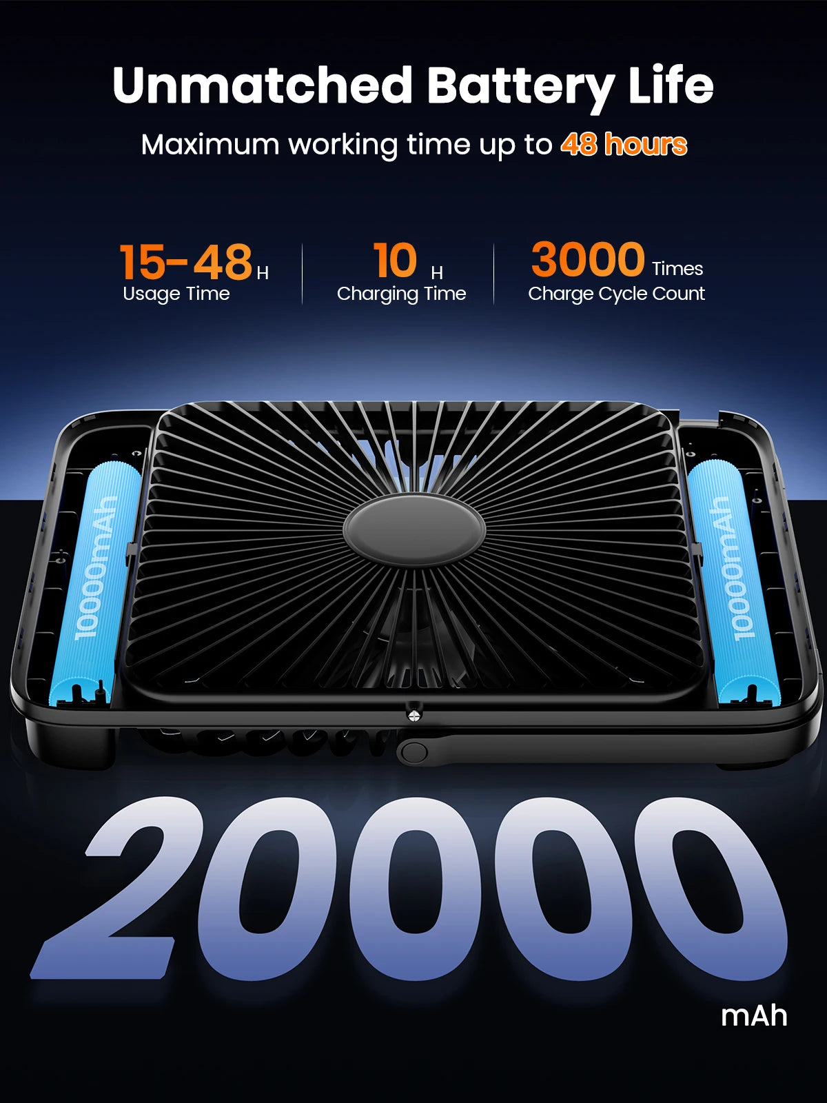 - Powerful Cooling Performance: Enjoy up to 48 hours of continuous cooling with a high-capacity 20000mAh rechargeable battery. Four speed settings and a 5-blade design provide whisper-quiet airflow for any setting.