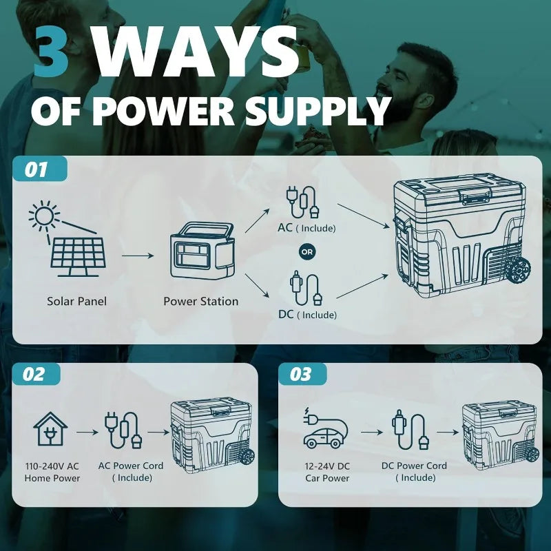 - Dual Power Options: Compatible with 12V/24V DC and 110-240V AC, perfect for home or car use.