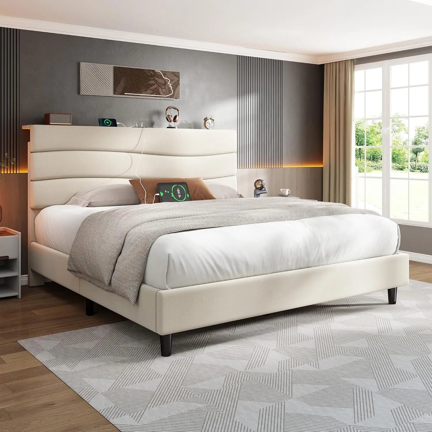 Queen Bed Frame Upholstered Headboard Storage Charging Station Easy Assembly
