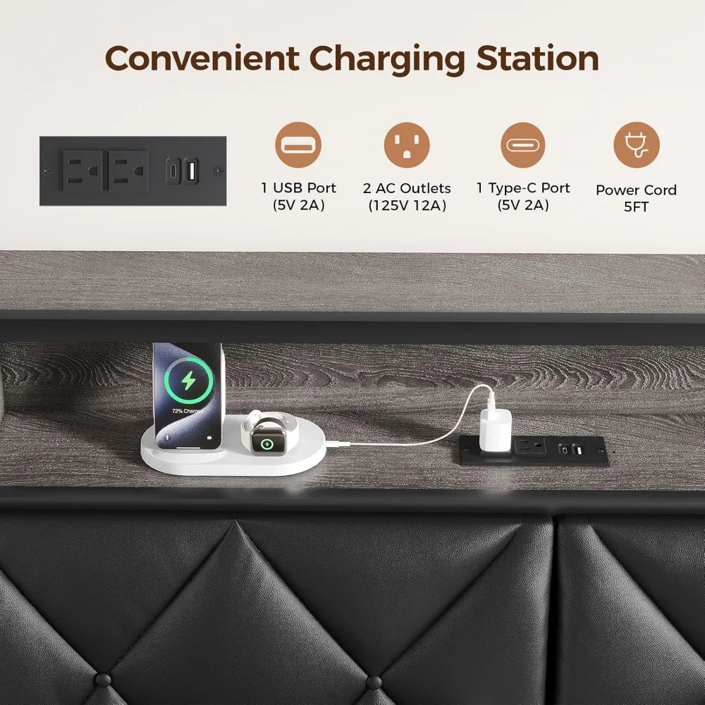 Headboard for Queen Bed with Storage LED Lights Charging Station