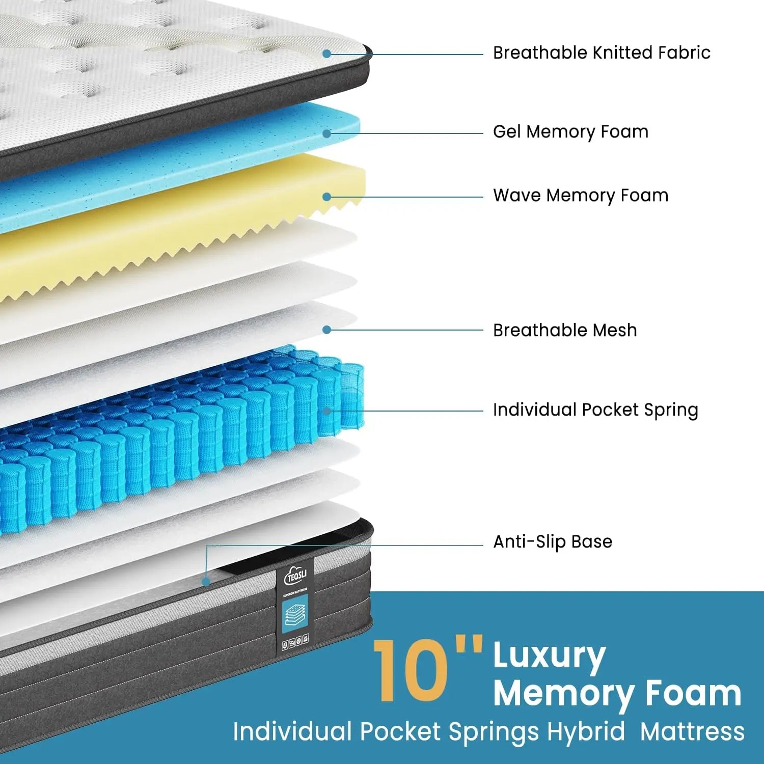 Transform your sleep with the Ljustra Queen Size 10 Inch Gel Memory Foam Pocket Springs Hybrid Mattress. Designed for ultimate comfort and support, this mattress is perfect for anyone seeking to alleviate back pain and enjoy a restful night's sleep.