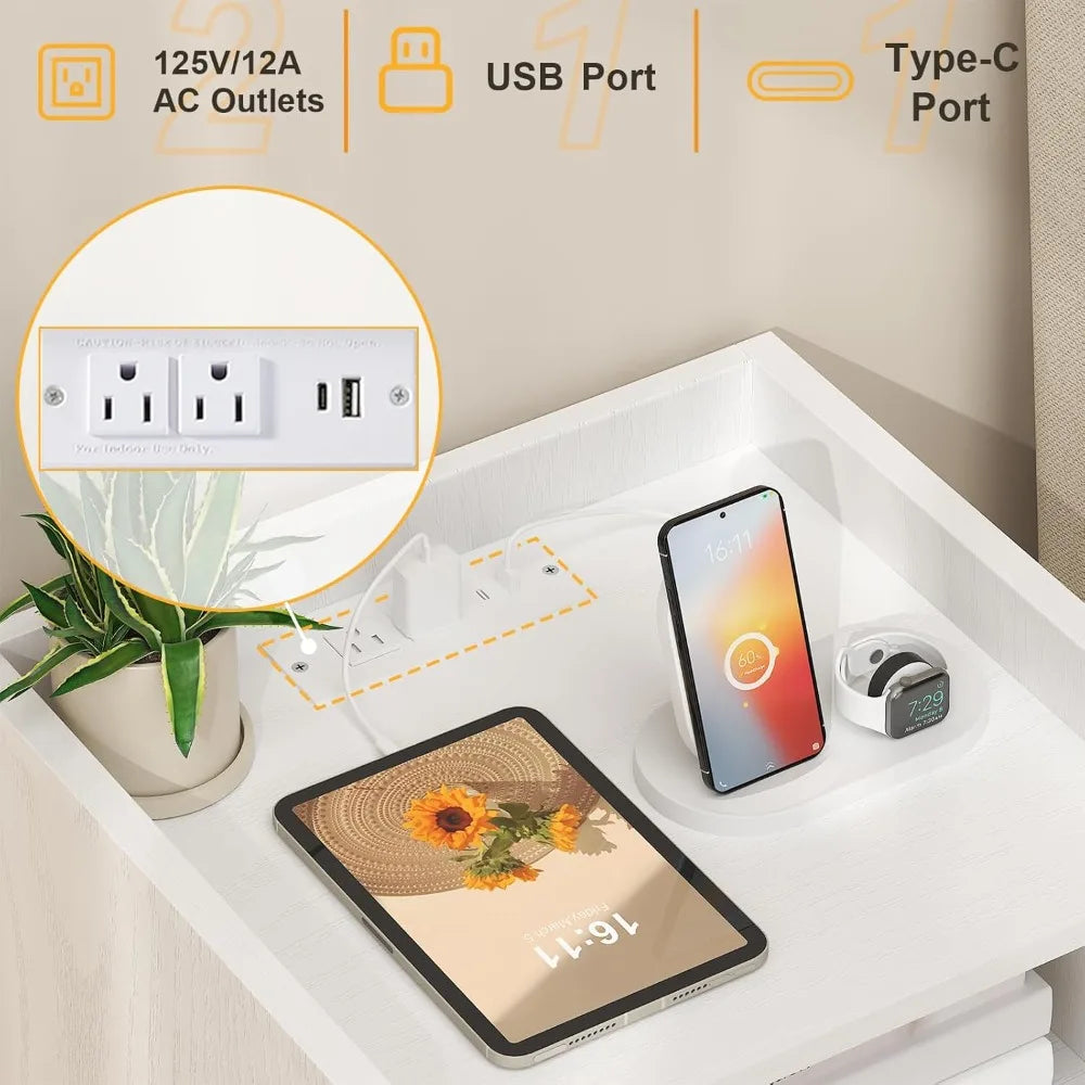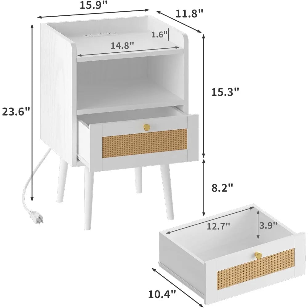 - Nightstand with Charging Station: Standing at 15.9"L x 11.8"W x 23.6"H, this rattan nightstand features a built-in charging station with 2 outlets, 1 USB port, and 1 Type-C port, allowing you to charge up to four devices simultaneously. Enjoy the freedom of placement with its 4.9-foot power cord.