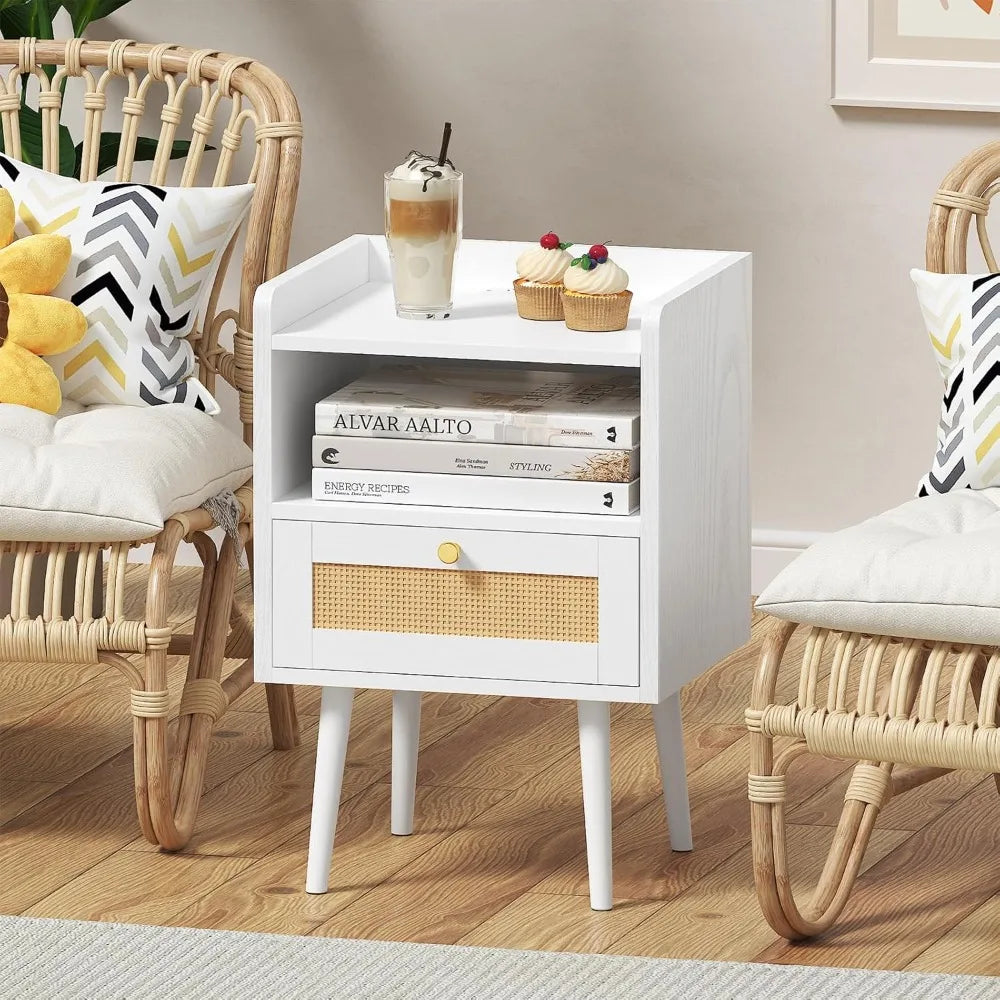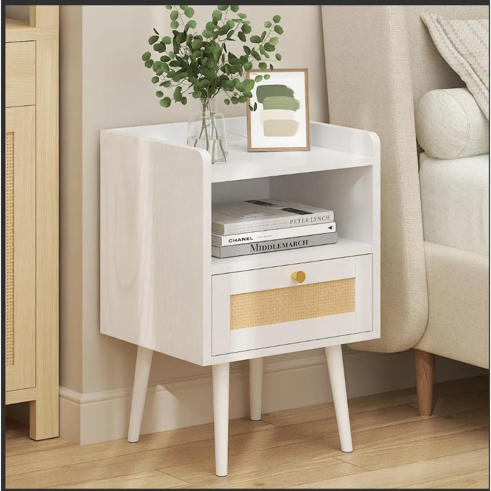 - Ample Storage Space: The spacious top surface is perfect for ornaments, while a compartment beneath provides convenient storage for books or personal items. The rattan-weave drawer ensures privacy while allowing airflow.