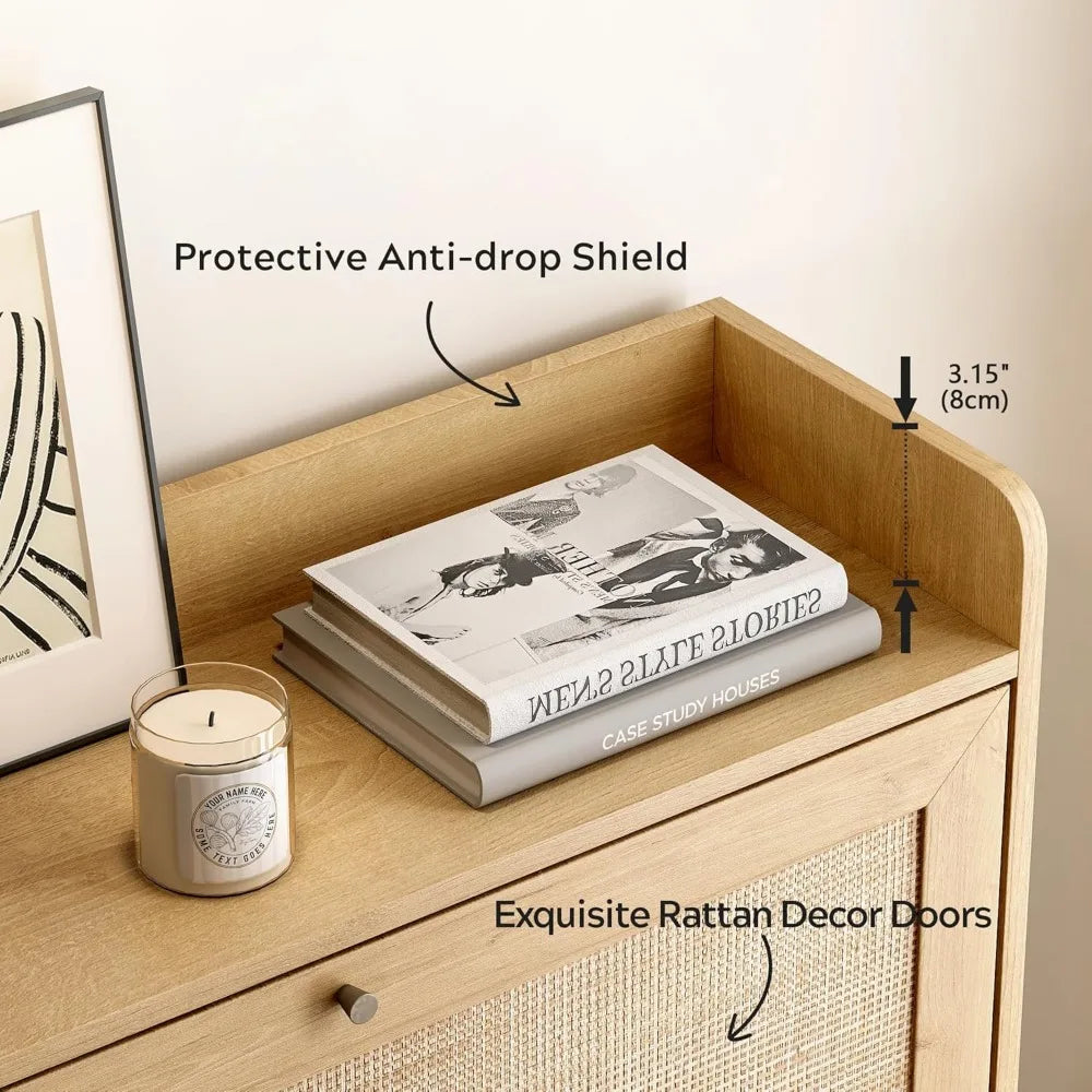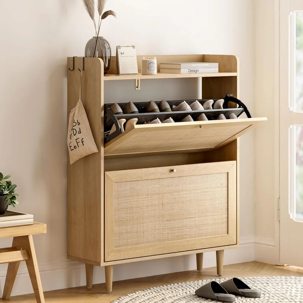 Introducing the Ljustra Rattan Shoe Cabinet — a stunning blend of functionality and style, perfect for your hallway, entryway, or living room. This mid-century modern shoe organizer elevates your home decor while providing efficient storage solutions.