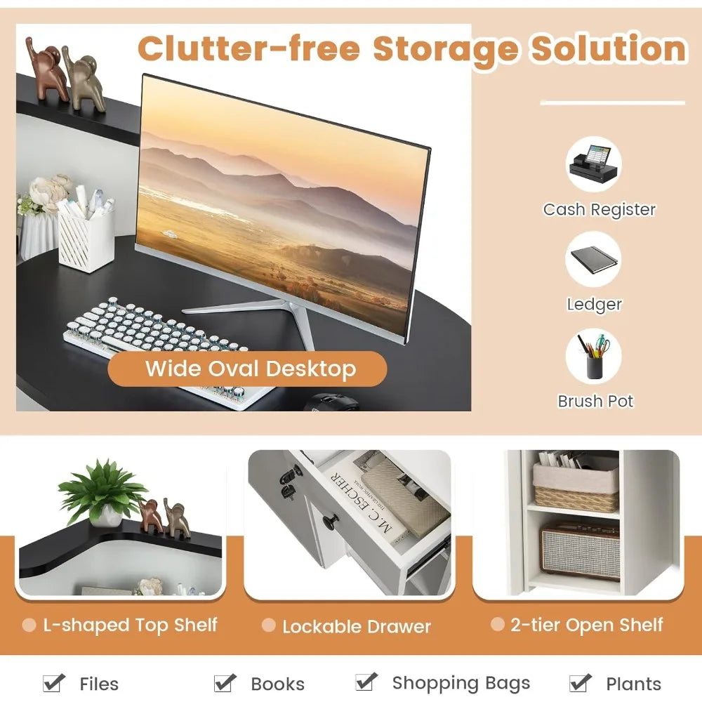 - Clutter-free Storage Solution: The wide oval desktop accommodates your cash register, computer, and decorative elements. The L-shaped top shelf and 2-tier open shelf provide easy access to your essentials, with a 3-position adjustable shelf for various item sizes.
