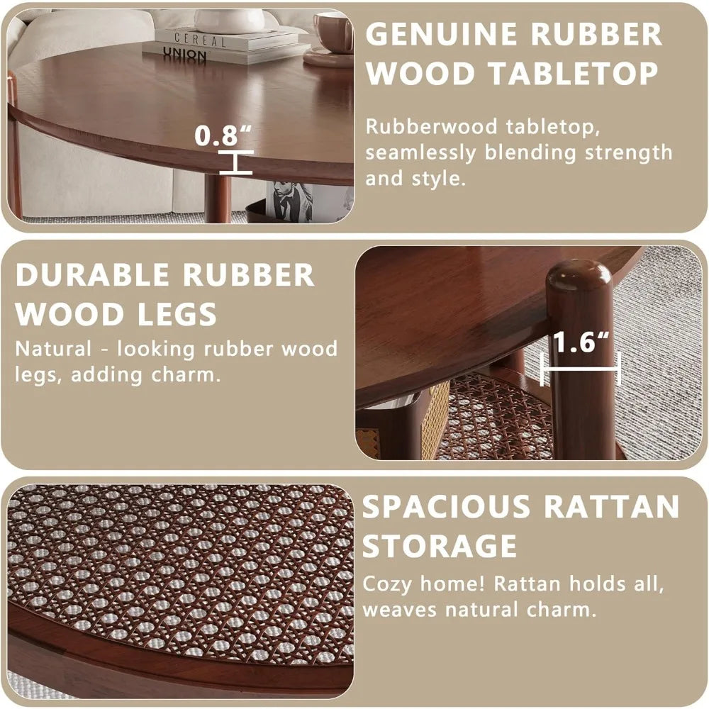 32 Inch Round Coffee Table Rustic Wood 2-Tier Boho Woven Storage