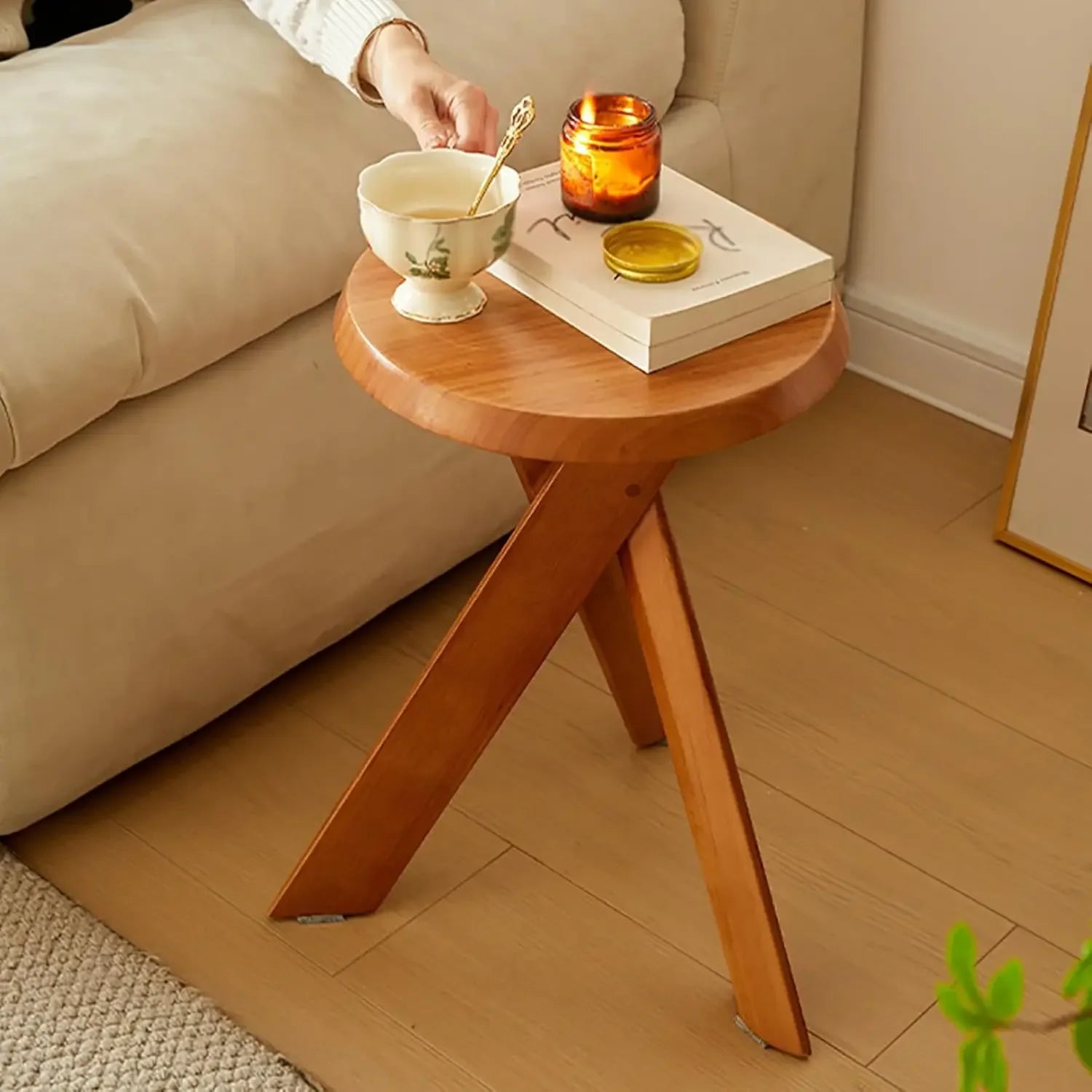 Round Coffee Table Solid Wood Rustic End Table with Crossed Legs