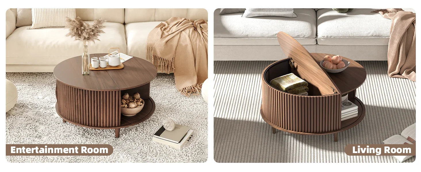 Transform your living room with the Ljustra Round Coffee Table, a perfect blend of modern design and practical functionality. This mid-century modern table features a chic fluted center design and a sliding cabinet door, offering both elegance and storage.