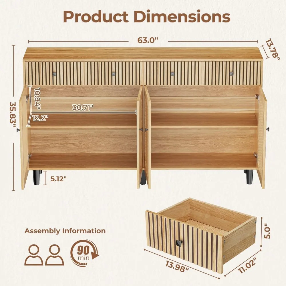 - Spacious Storage: Equipped with 4 fluted drawers and 4 doors, this sideboard provides generous space for silverware, kitchen tools, and more.