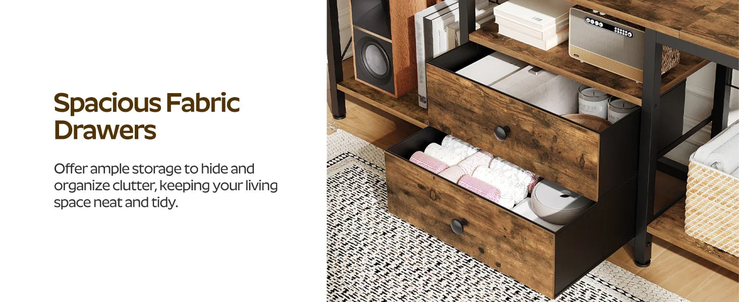 - Spacious Storage: Features 2 fabric drawers and open shelves for organized media storage—perfect for your TV, gaming consoles, and accessories.