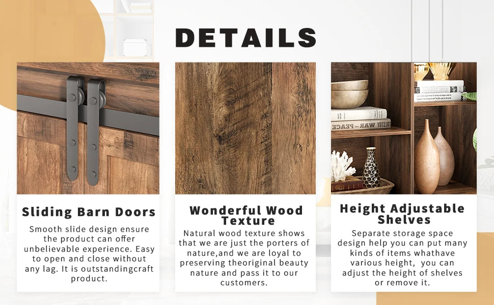 - Stylish Sliding Doors: The unique sliding barn doors allow you to conceal your storage cabinet or media devices when not in use, keeping your space tidy.