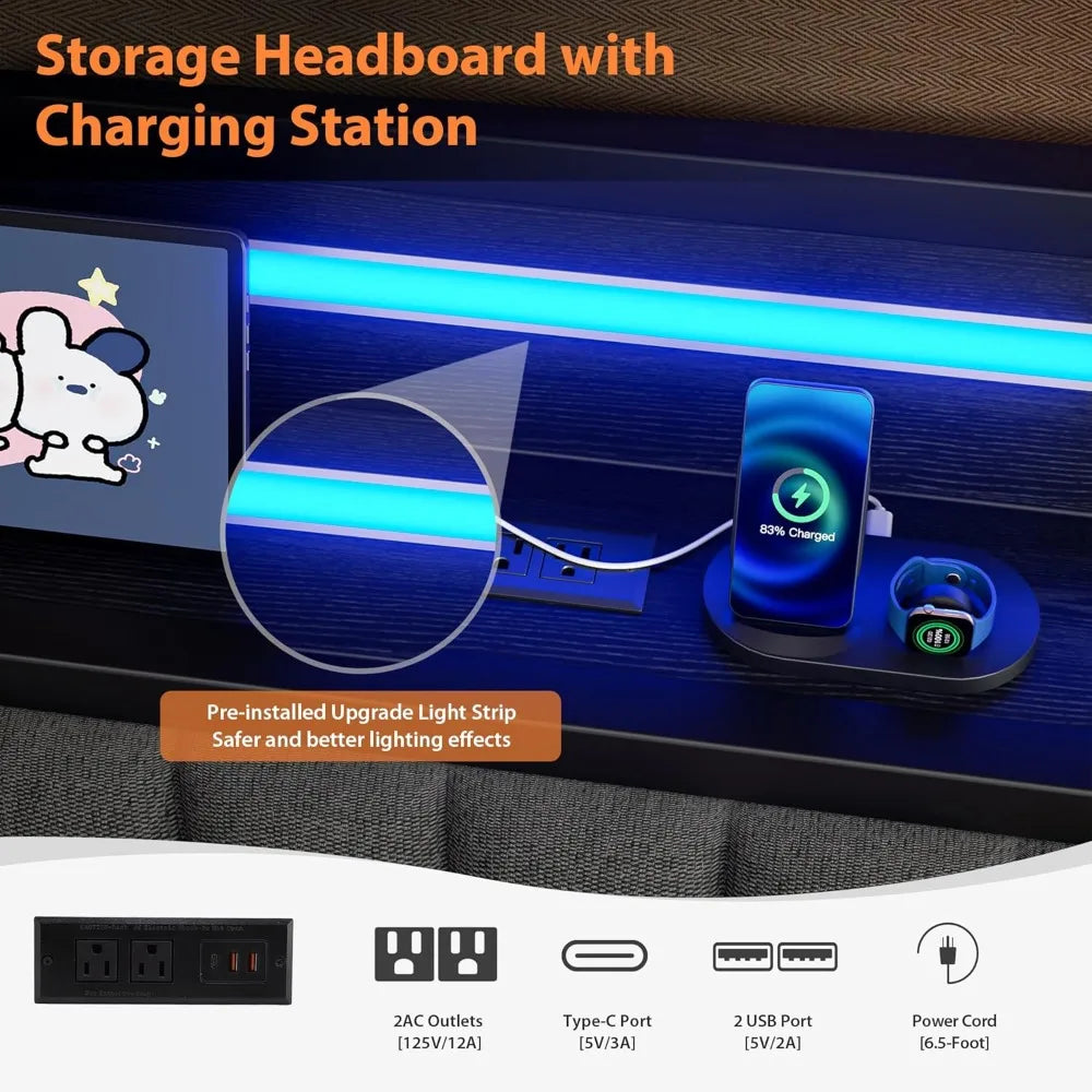 - Storage Headboard with Charging Station: Includes 2 outlets, 2 USB ports, and a Type-C port for convenient device charging.