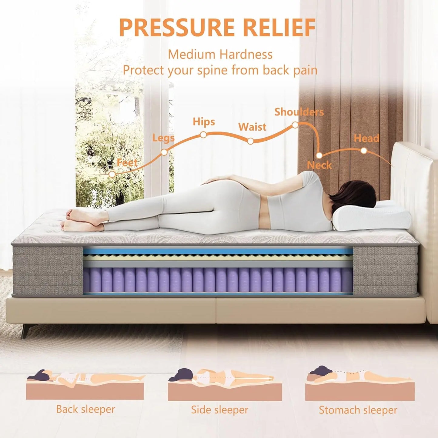- Pressure Relief: The cooling gel memory foam and pocketed springs work together to distribute weight evenly, reducing pressure and providing total support.