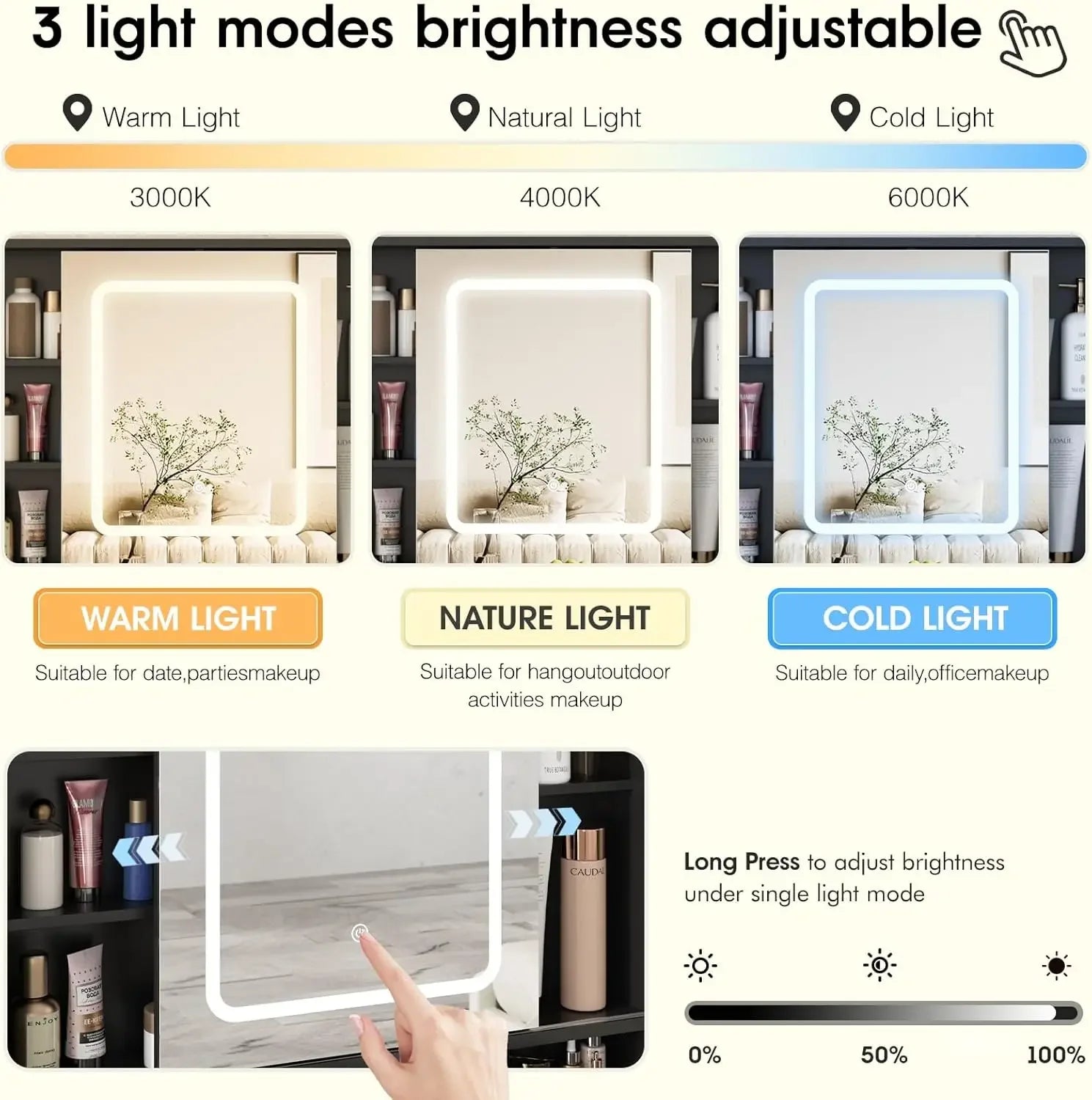 - Sliding Mirror with LED Light: Enjoy a large mirror with built-in LED lights offering 3 color modes—Natural, Warm, and Cold—to suit your makeup needs perfectly.