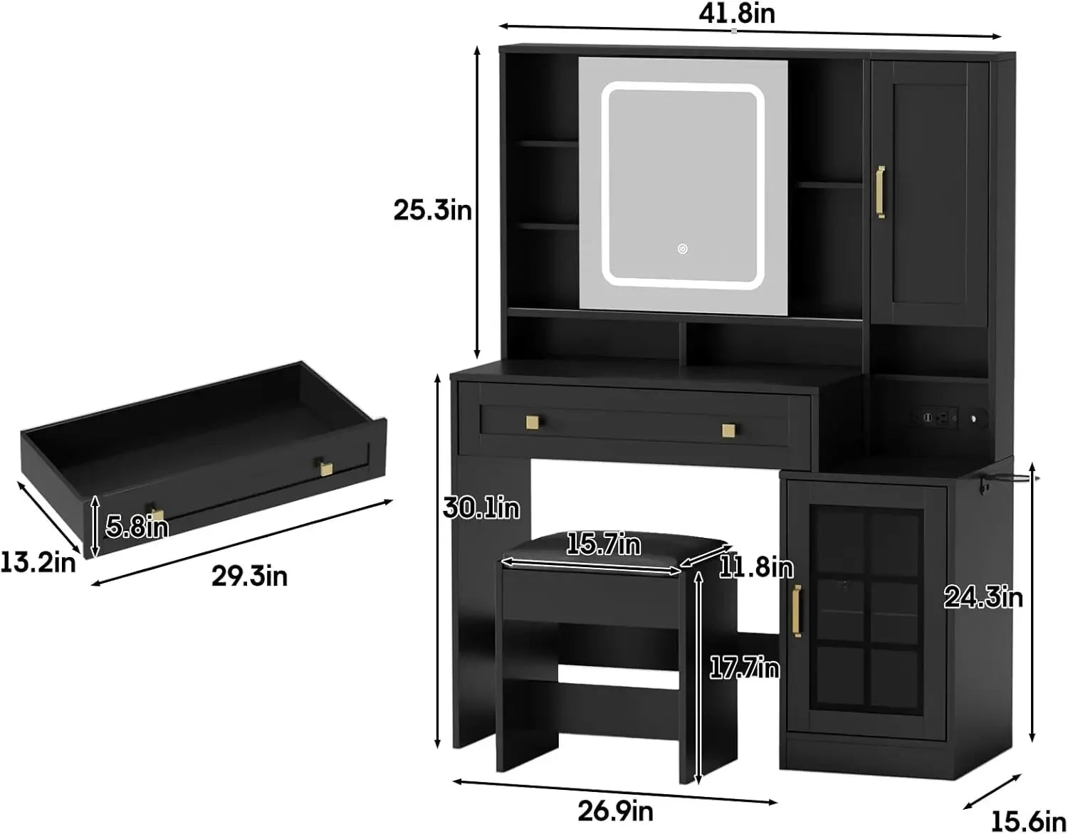 - Large Capacity & Unique Design: This vanity desk features 2 cabinets, a spacious drawer, and multiple shelves, providing ample storage for your cosmetics and jewelry.
