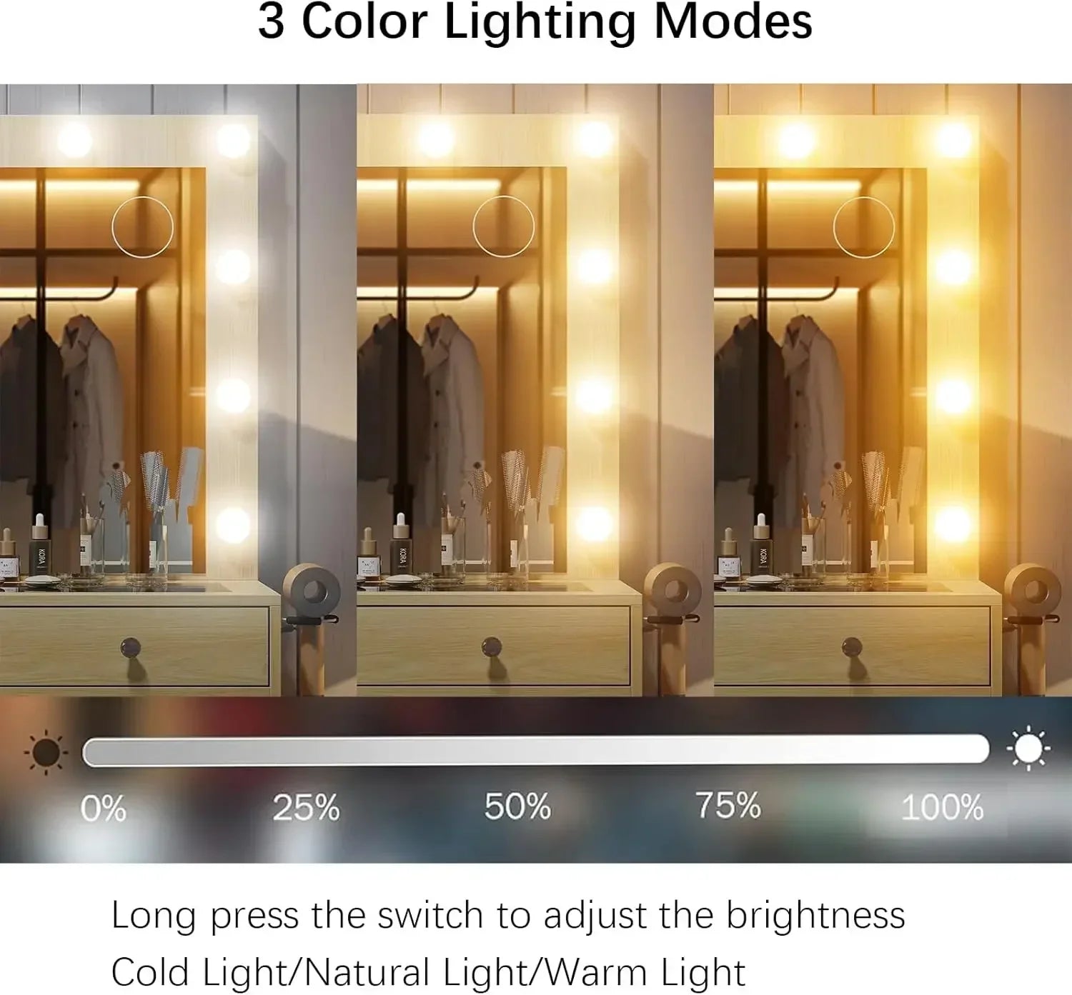 - 3 Lighting Modes & Brightness Adjustable: Equipped with an HD mirror and 12 bright LED lights, choose from warm, natural, or cool lighting to suit your makeup needs.