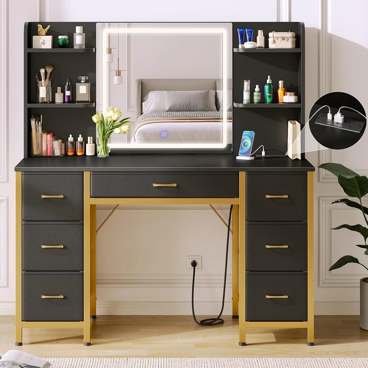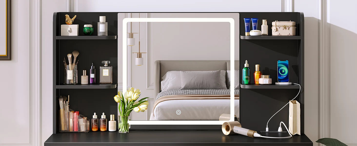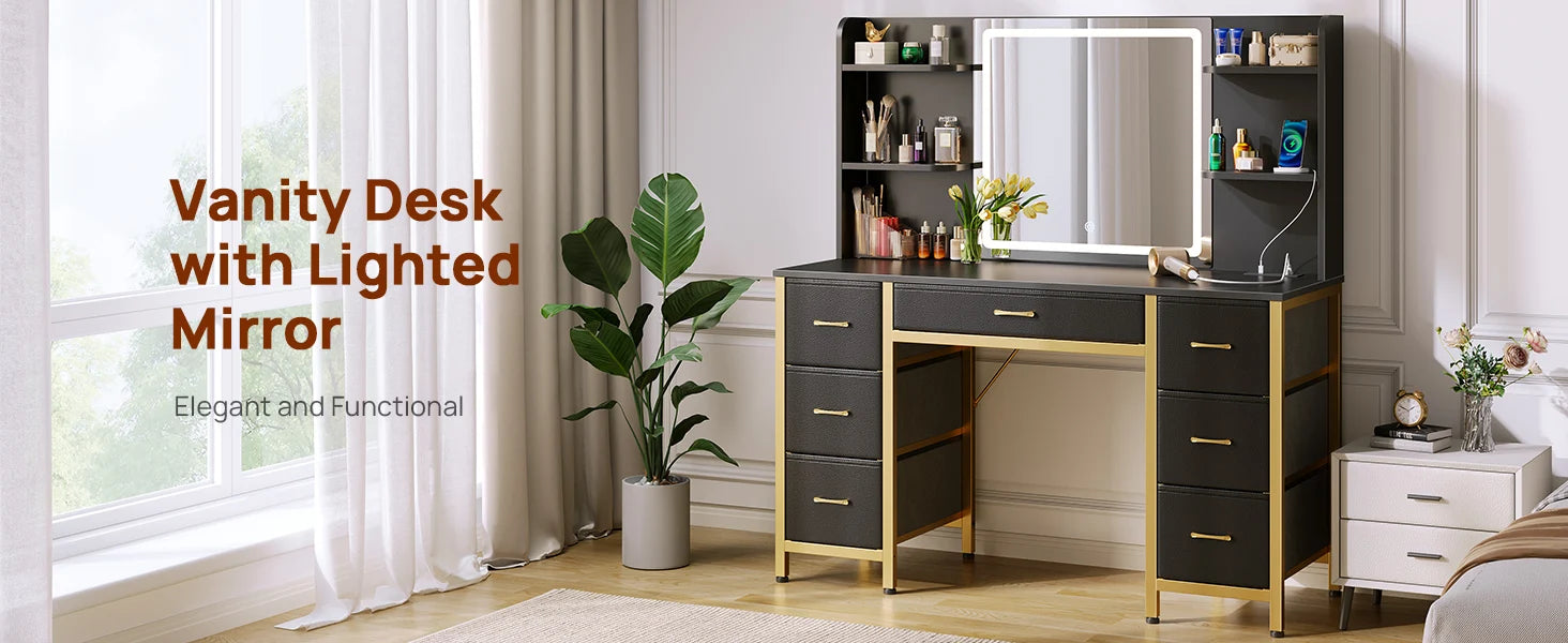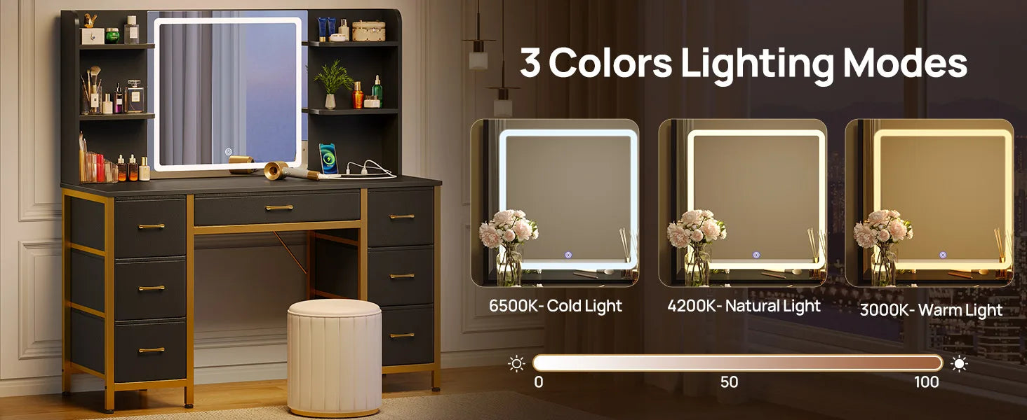Vanity Desk with Lighted Mirror Power Outlet 7 Drawers 3 Lighting Modes