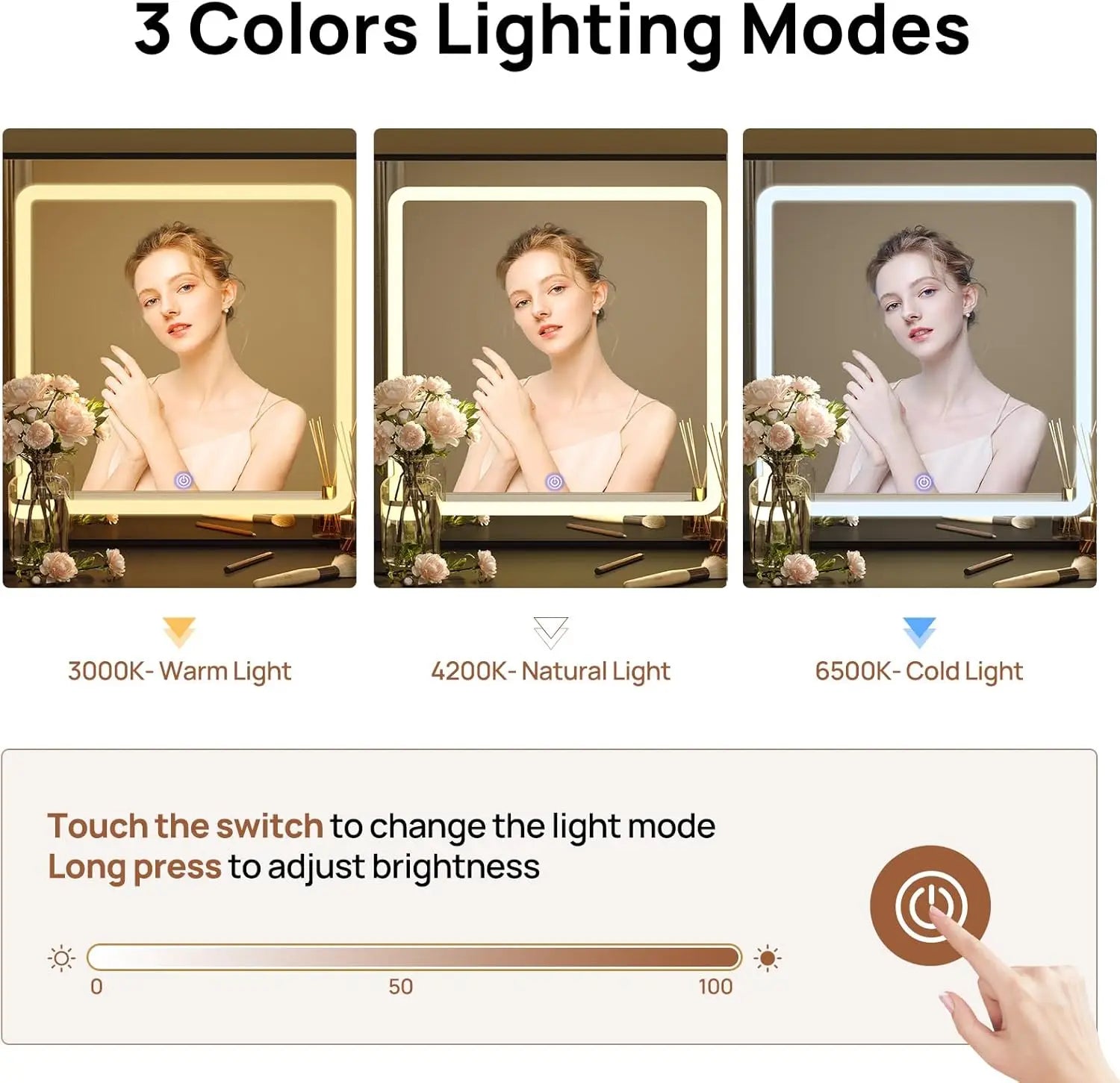 - Lighted Mirror: Adjustable LED mirror with 3 lighting modes and adjustable brightness for a flawless look.