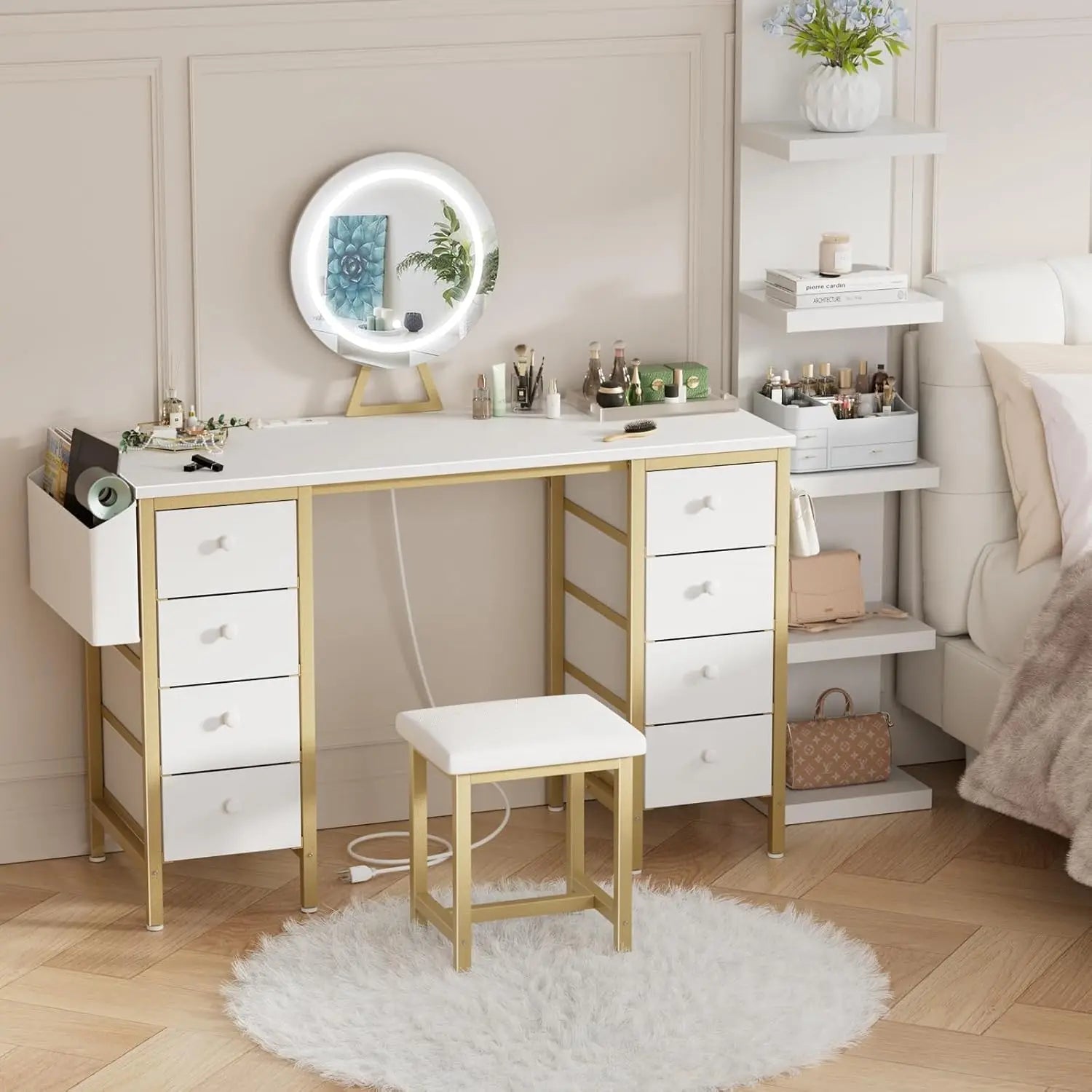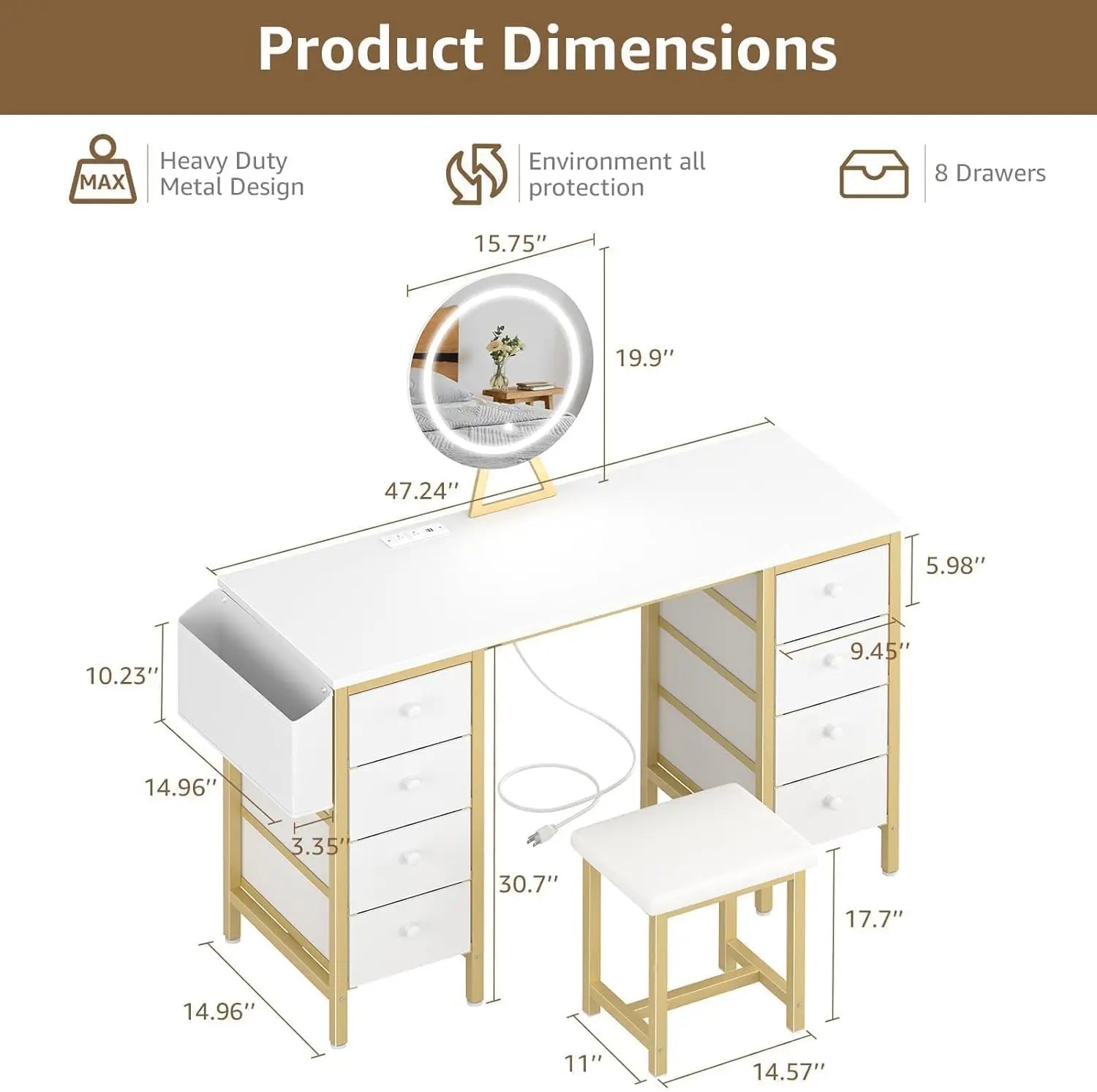 Ljustra Vanity Desk with Lighted Mirror and Chair 8 Drawers Power Outlet
