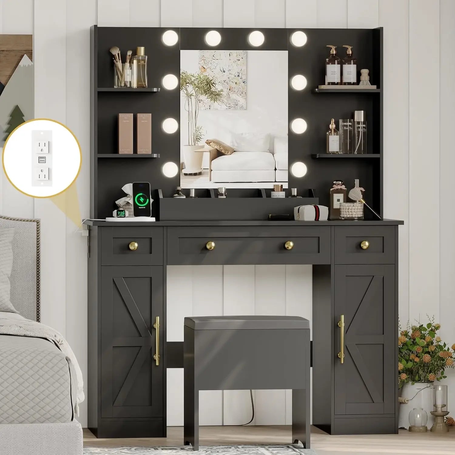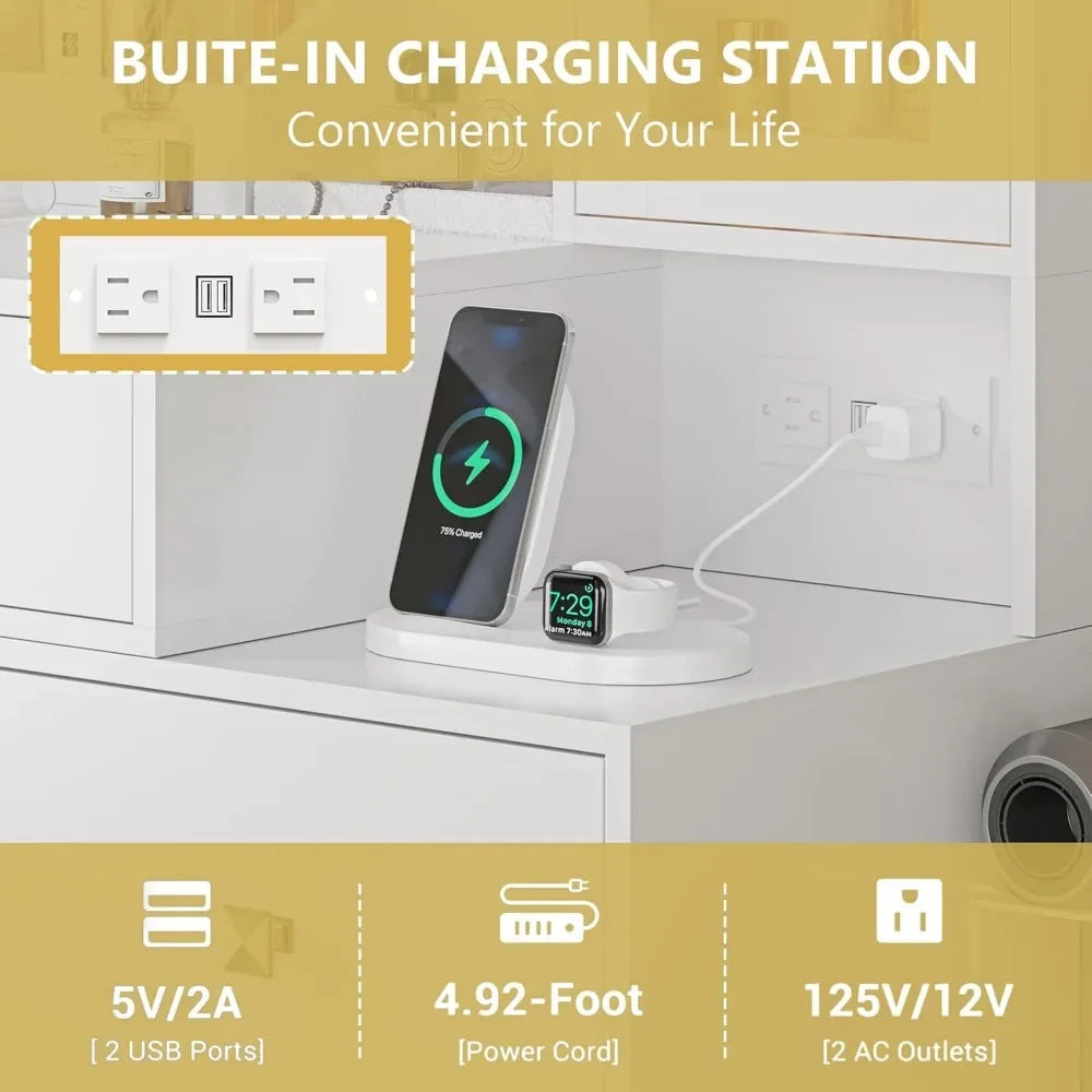 - Built-In Charging Station: Stay connected with 2 AC outlets and 2 USB ports, perfect for charging your devices while you get ready.