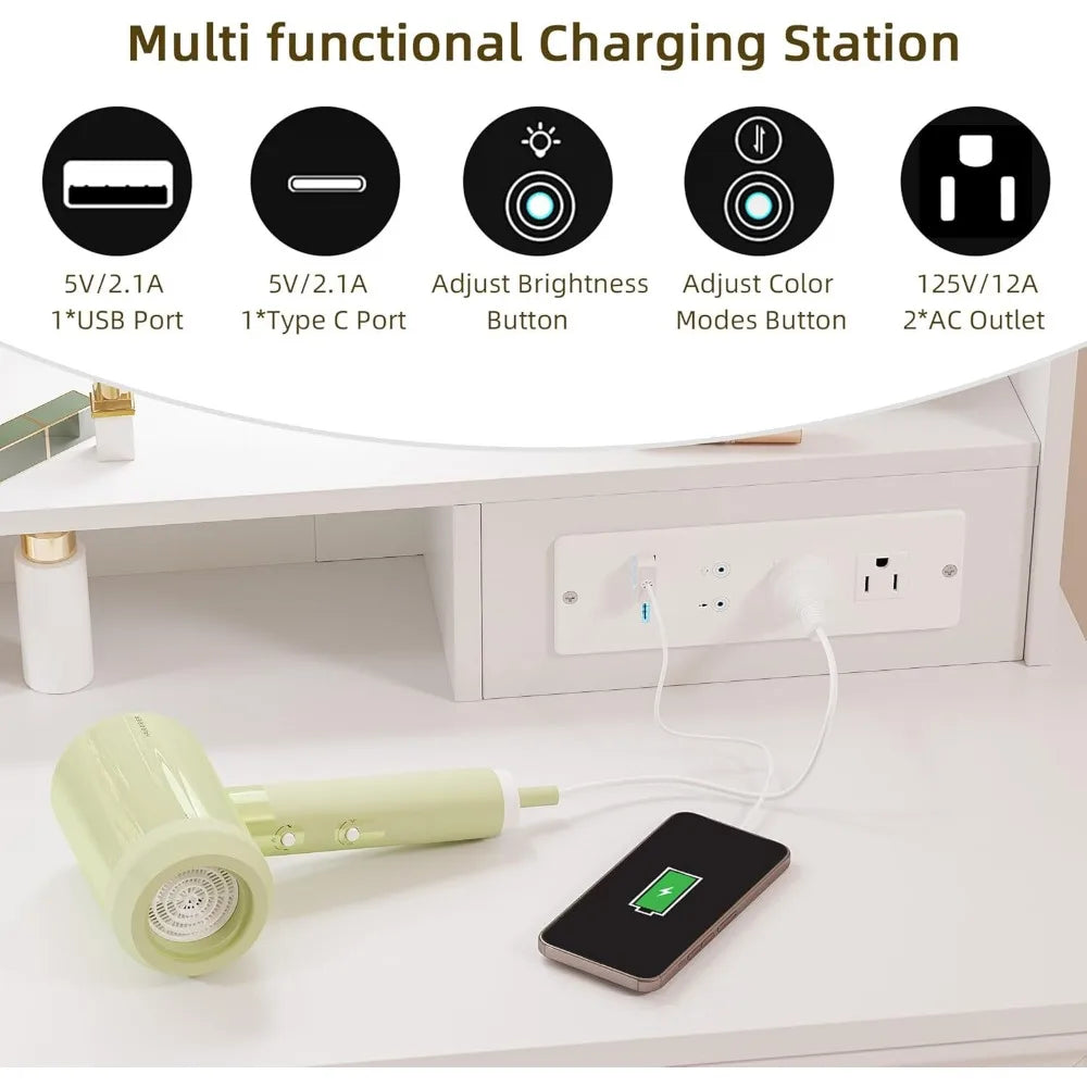- Built-In Charging Station: Comes with 2 AC power outlets, 1 Type-C port, and 1 USB port for charging your devices while getting ready.