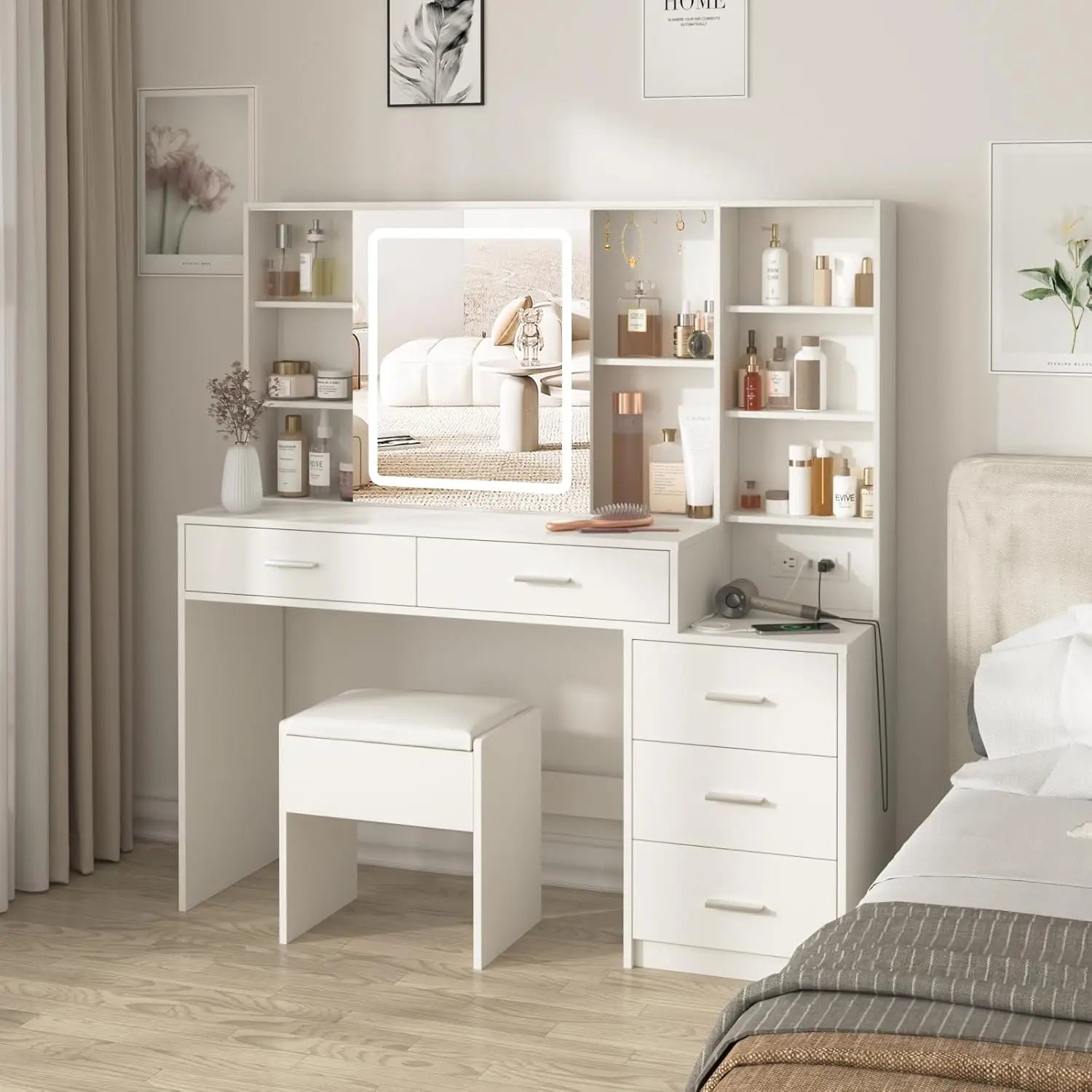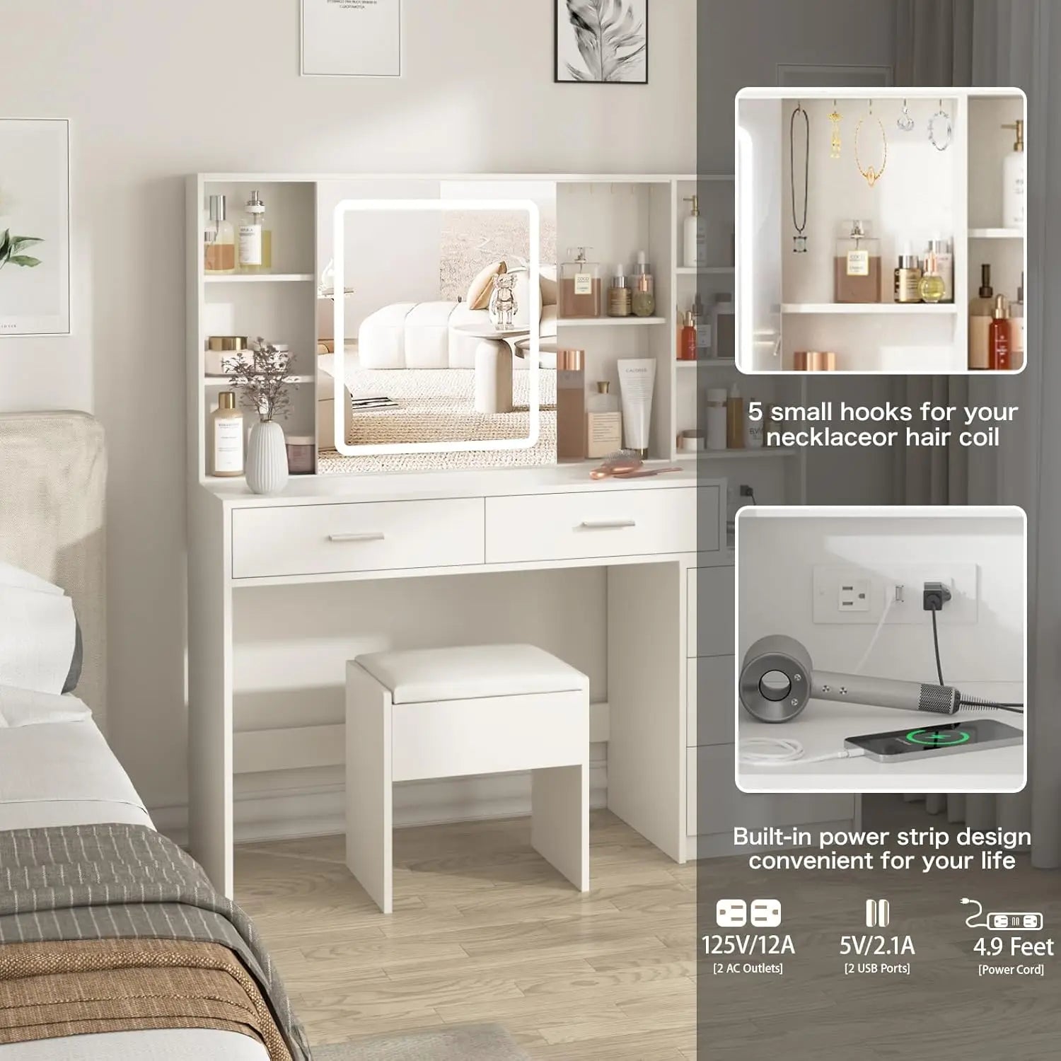 Vanity Desk with Mirror LED Lights Makeup Table Storage Charging Station