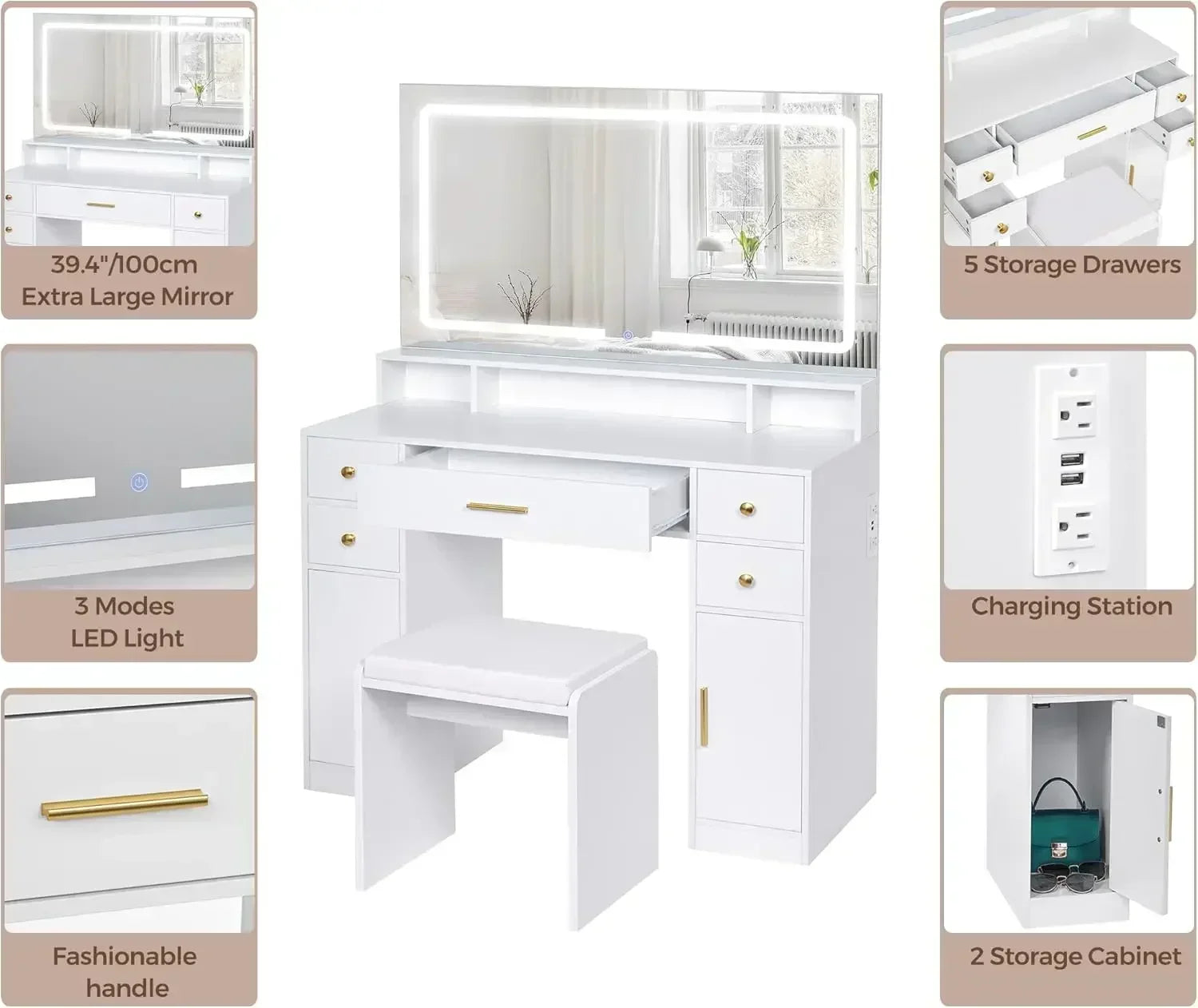 Vanity Desk Set LED Lighted Mirror Makeup Table with Storage and Stool