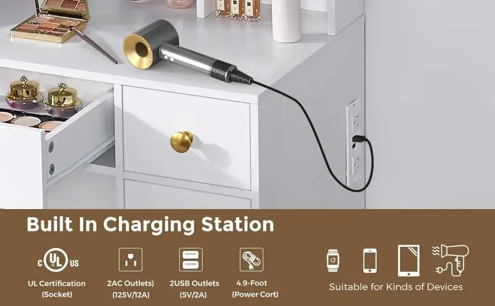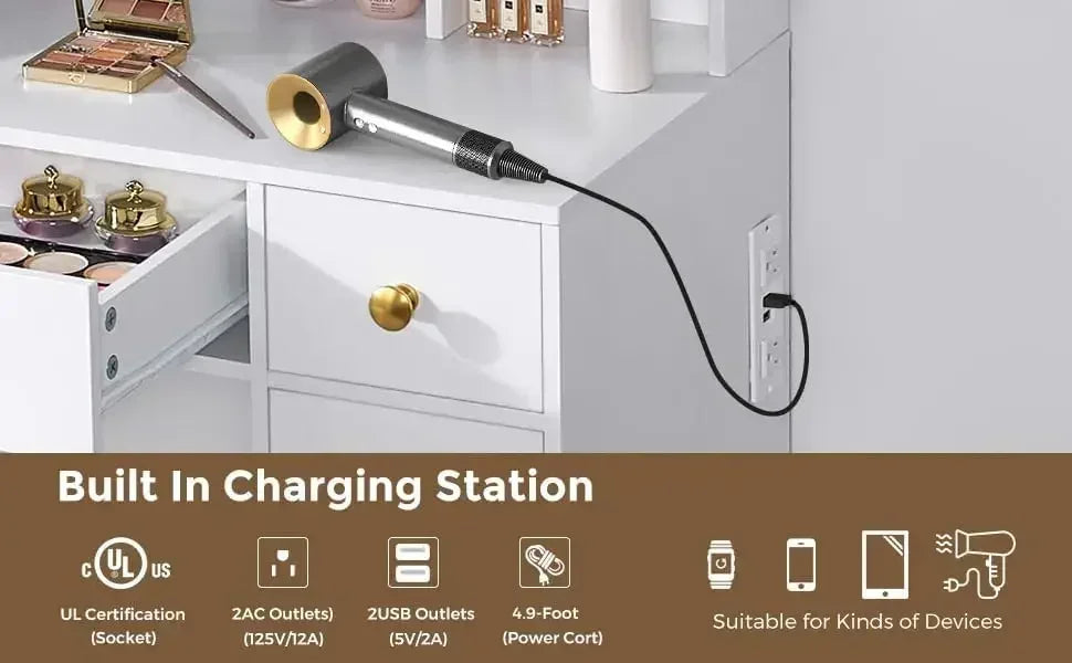 - Convenient Charging Station: Equipped with two standard plug sockets and two USB ports, you can easily charge your devices while getting ready.