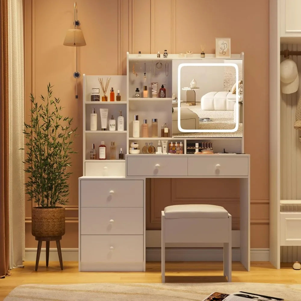 Vanity Makeup Mirror Desk with Stool Charging Station LED Lighted Storage